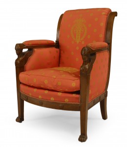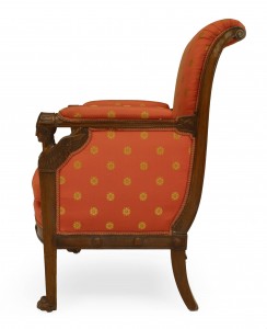 PAIR of French Empire (Early 19th Century) mahogany bergeres Armchairs upholstered in red silk with scrolled back above winged caryatid arm uprights and a loose seat cushion (PRICED AS PAIR)