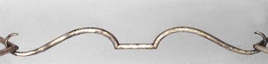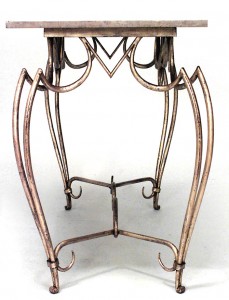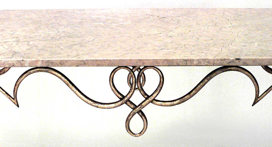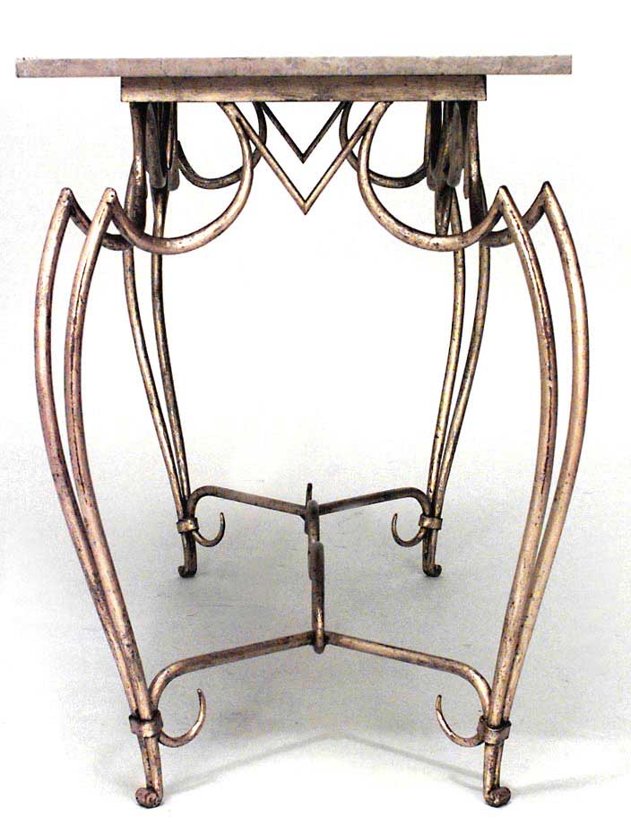 French 1940s gold painted iron center table with rectangular beige marble top above scrolling apron & legs joined by a stretcher (attributed to RENE PROU).