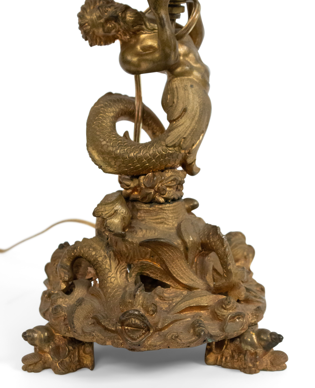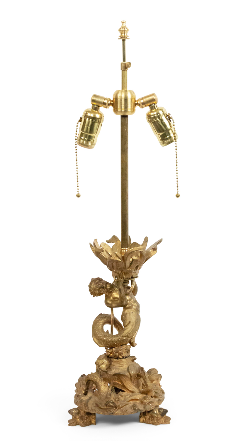French Louis XV-style (19th Century) bronze dore table lamp with Neptune & dolphins at base holding glass globe with etched stars fabricated from a compote base..
