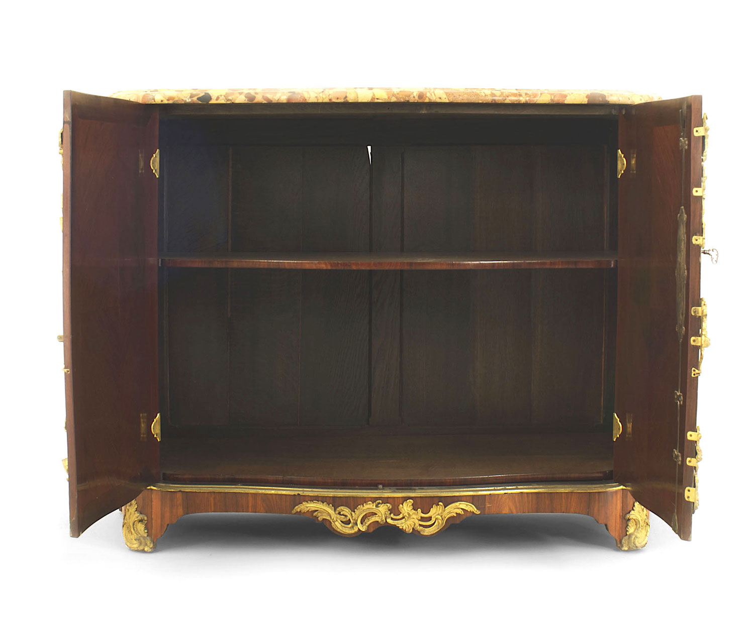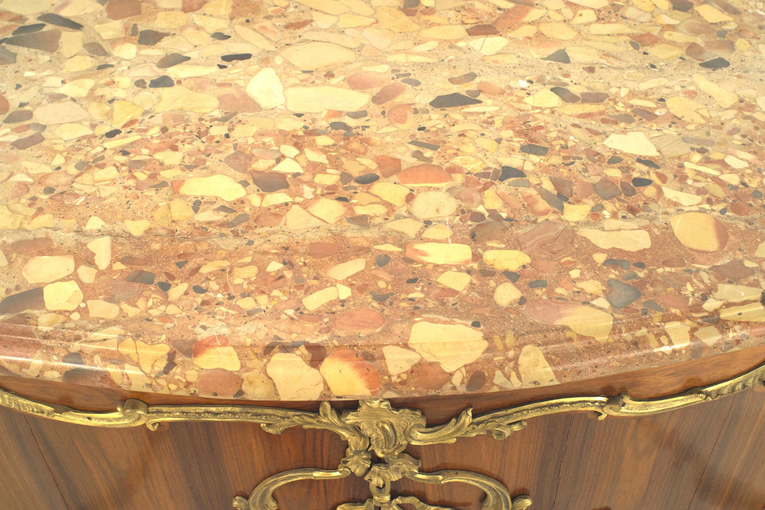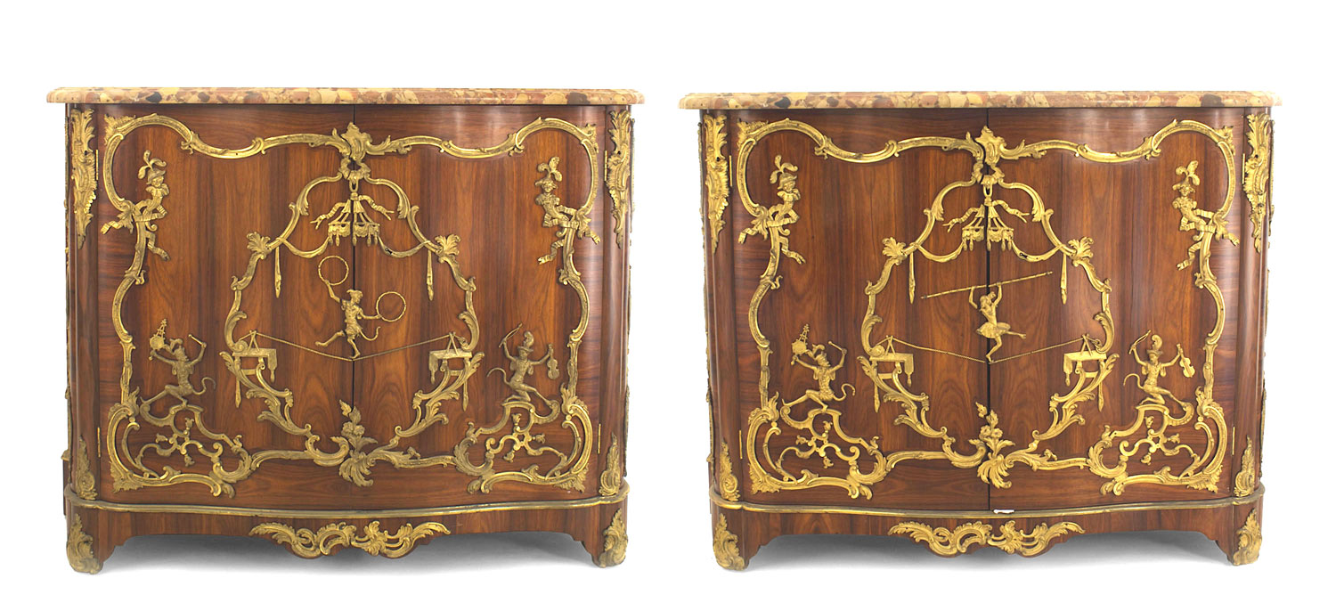 PAIR of French Louis XV (Late 19th Century) rosewood 2 door commodes with bronze dore trim with singerie (monkey) design & shaped marble top (stamped: CHARLES CRESSENT) (PRICED AS PAIR).