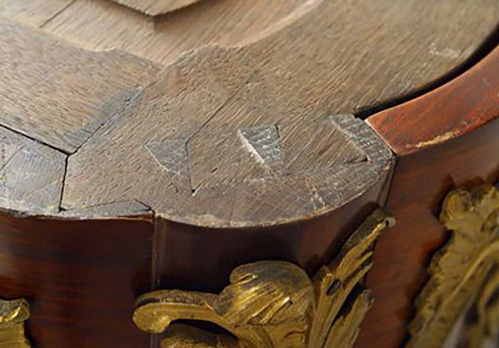 Style: French Materials & Techniques: Bronze, marble, rosewood, stamped, wood Category: Tables, Cabinets & Case Goods, Dining Room Condition: One of marble tops has a crack going across the surface. Good; Wear consistent with age and use