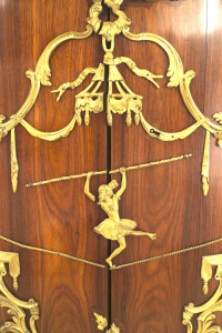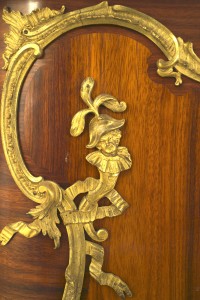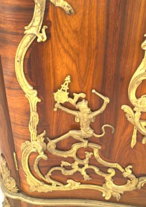 PAIR of French Louis XV (Late 19th Century) rosewood 2 door commodes with bronze dore trim with singerie (monkey) design & shaped marble top (stamped: CHARLES CRESSENT) (PRICED AS PAIR)..