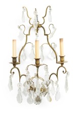 French Louis XV-style (20th Century) bronze dore wall sconce with three arms and decorative crystals.