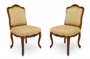 PAIR of French Louis XV style (19th Cent) walnut carved side chairs with shaped back and cream upholstered seat and back.