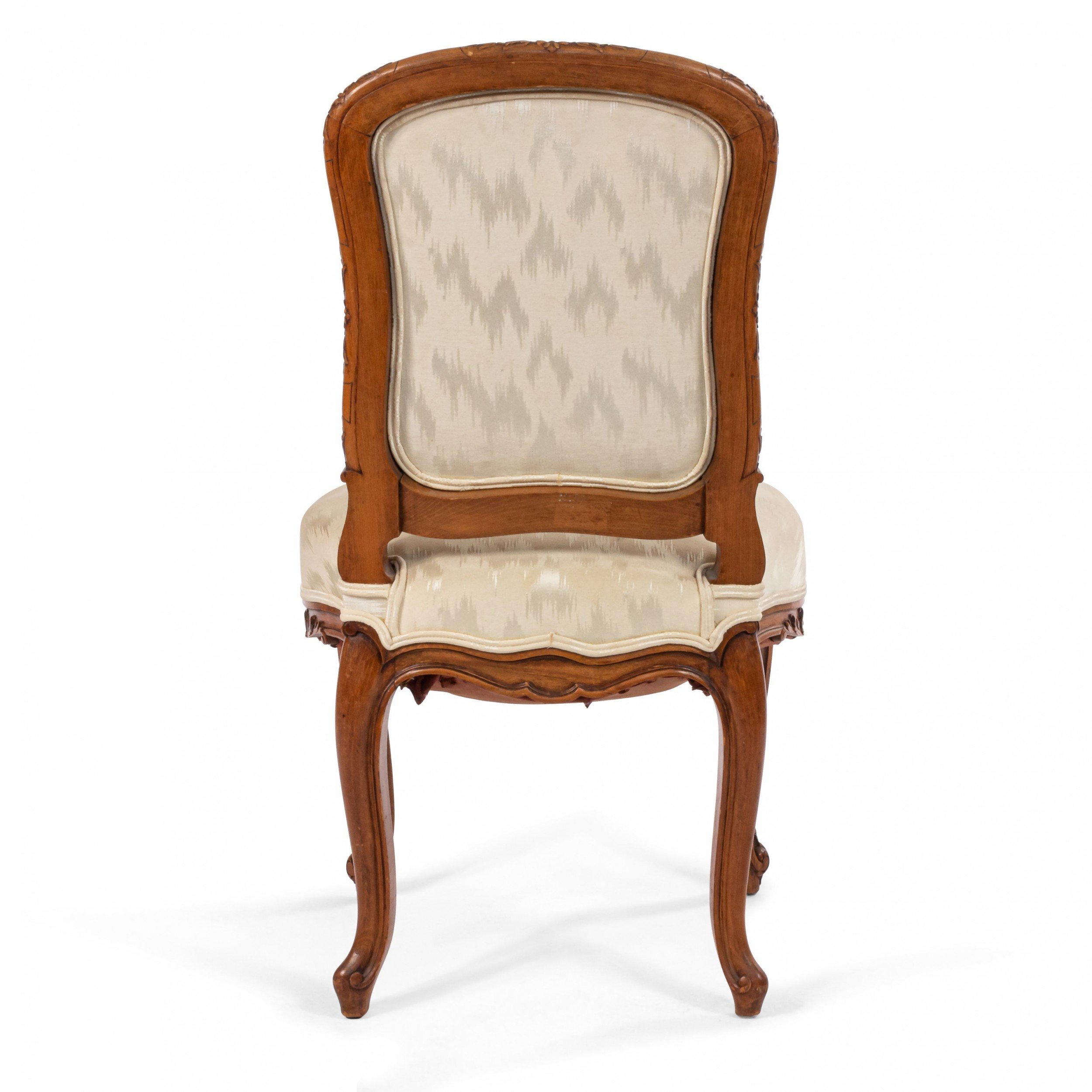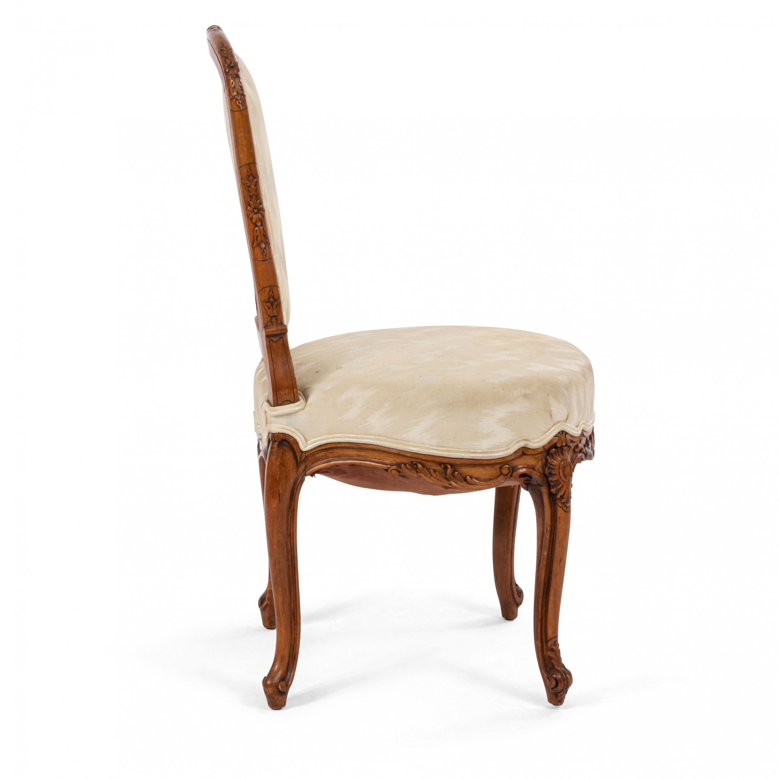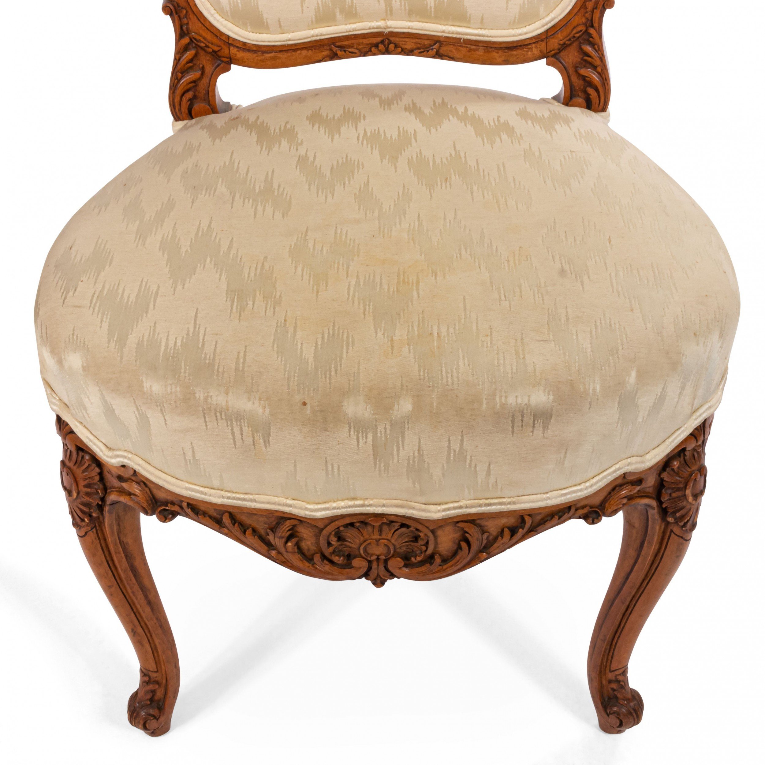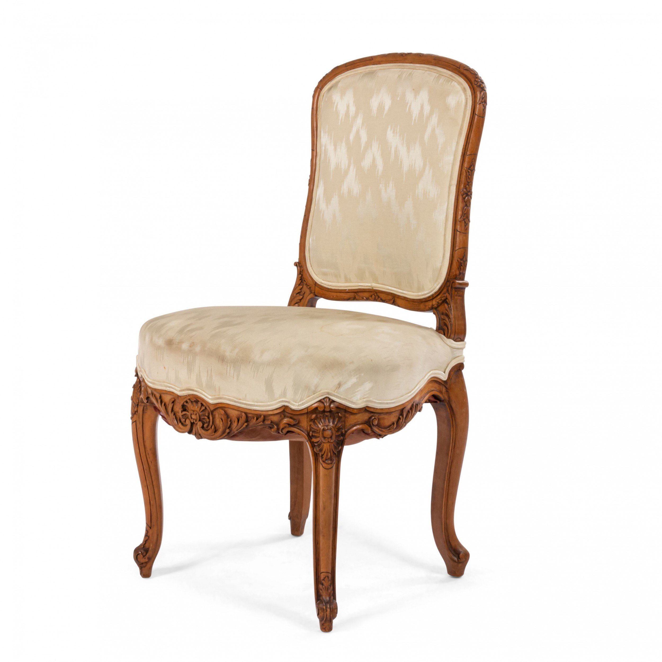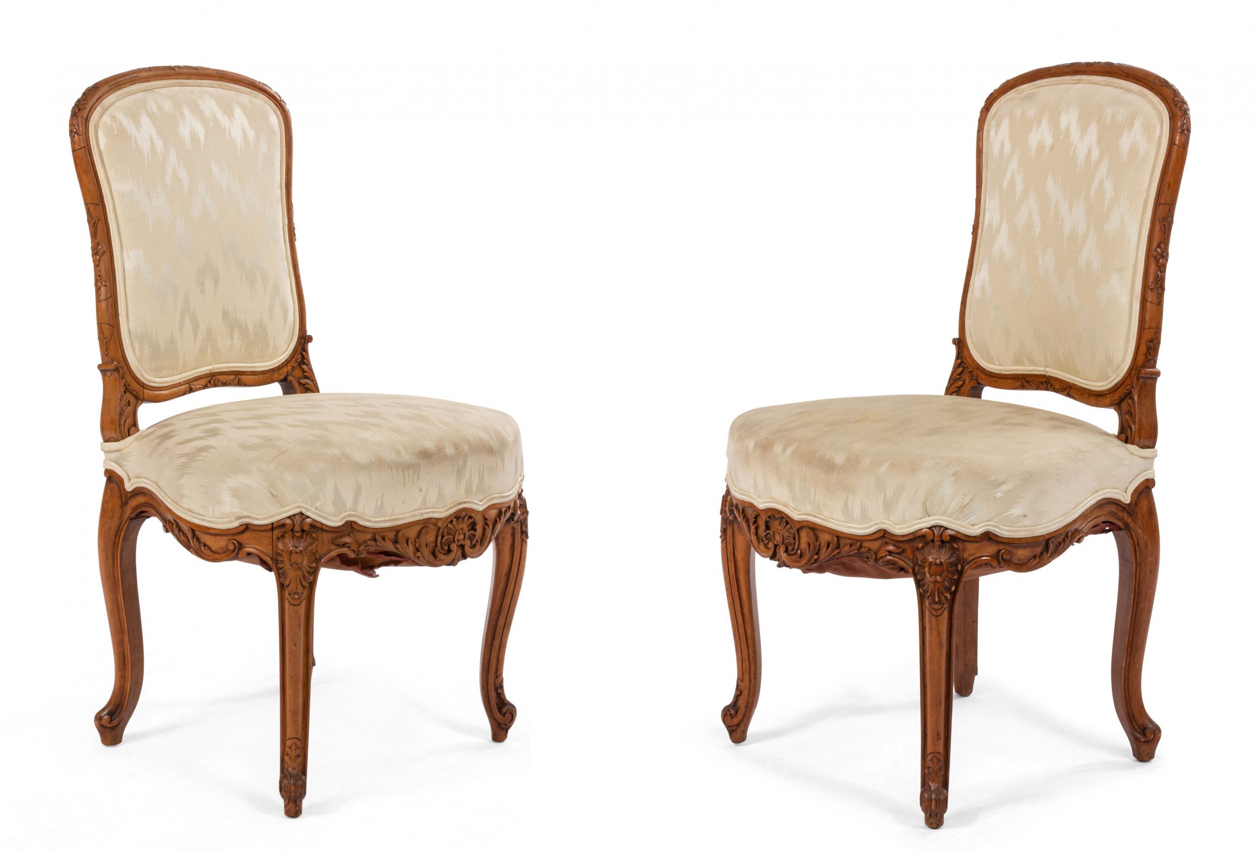 PAIR of French Louis XV style (19th Cent) walnut side chairs with a floral carved frame and upholstered seat & back