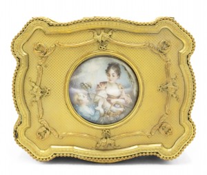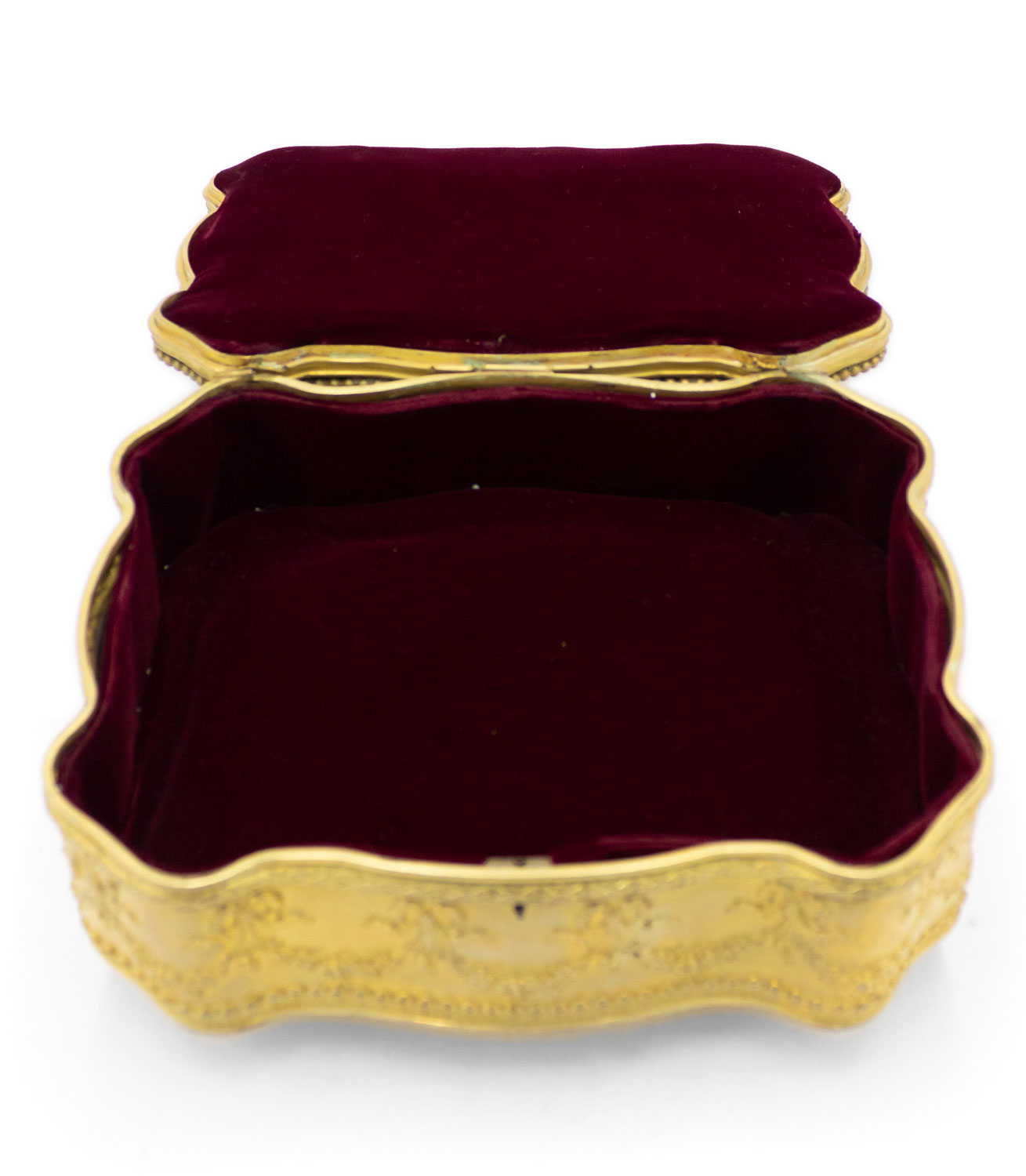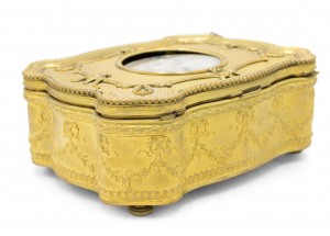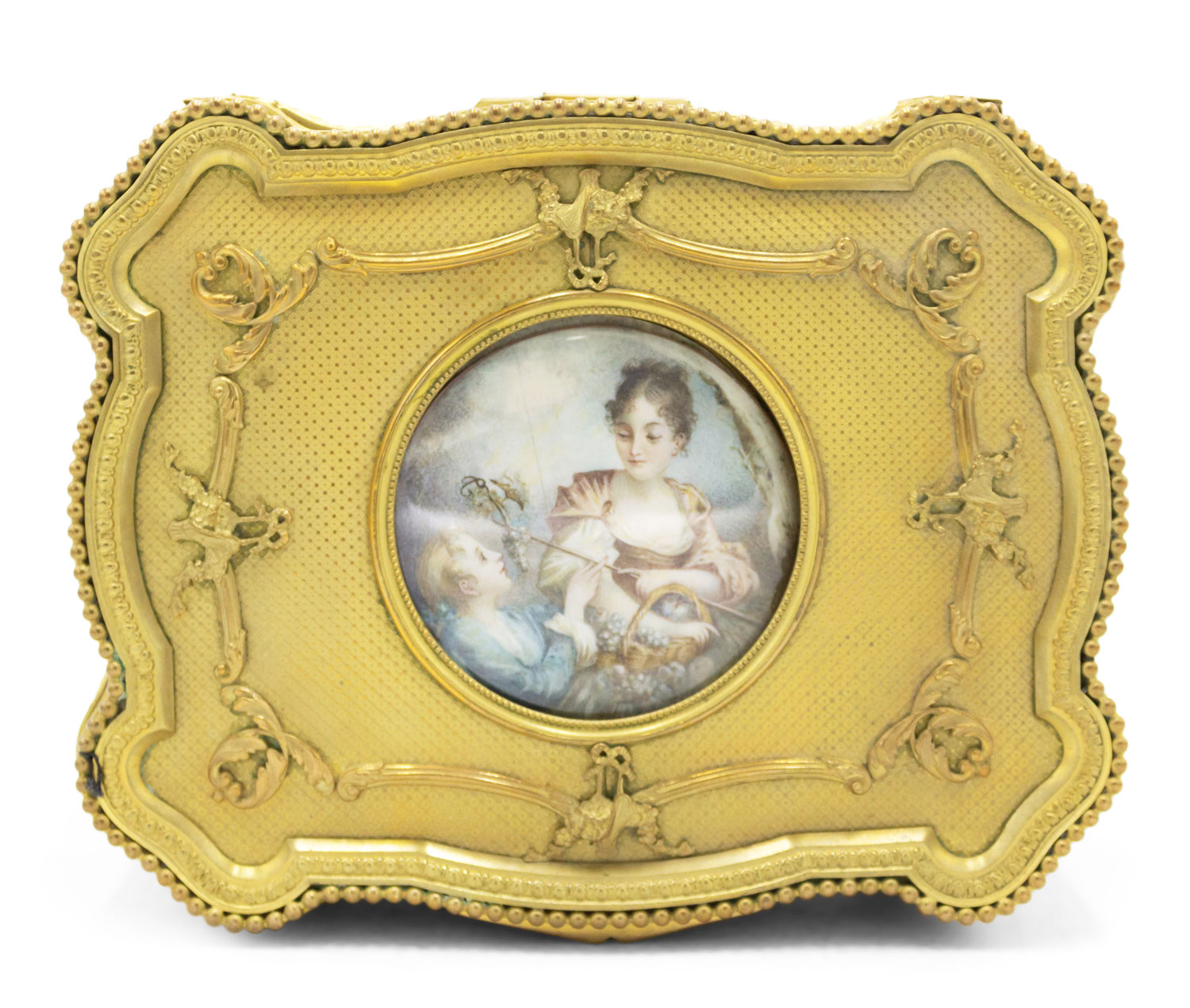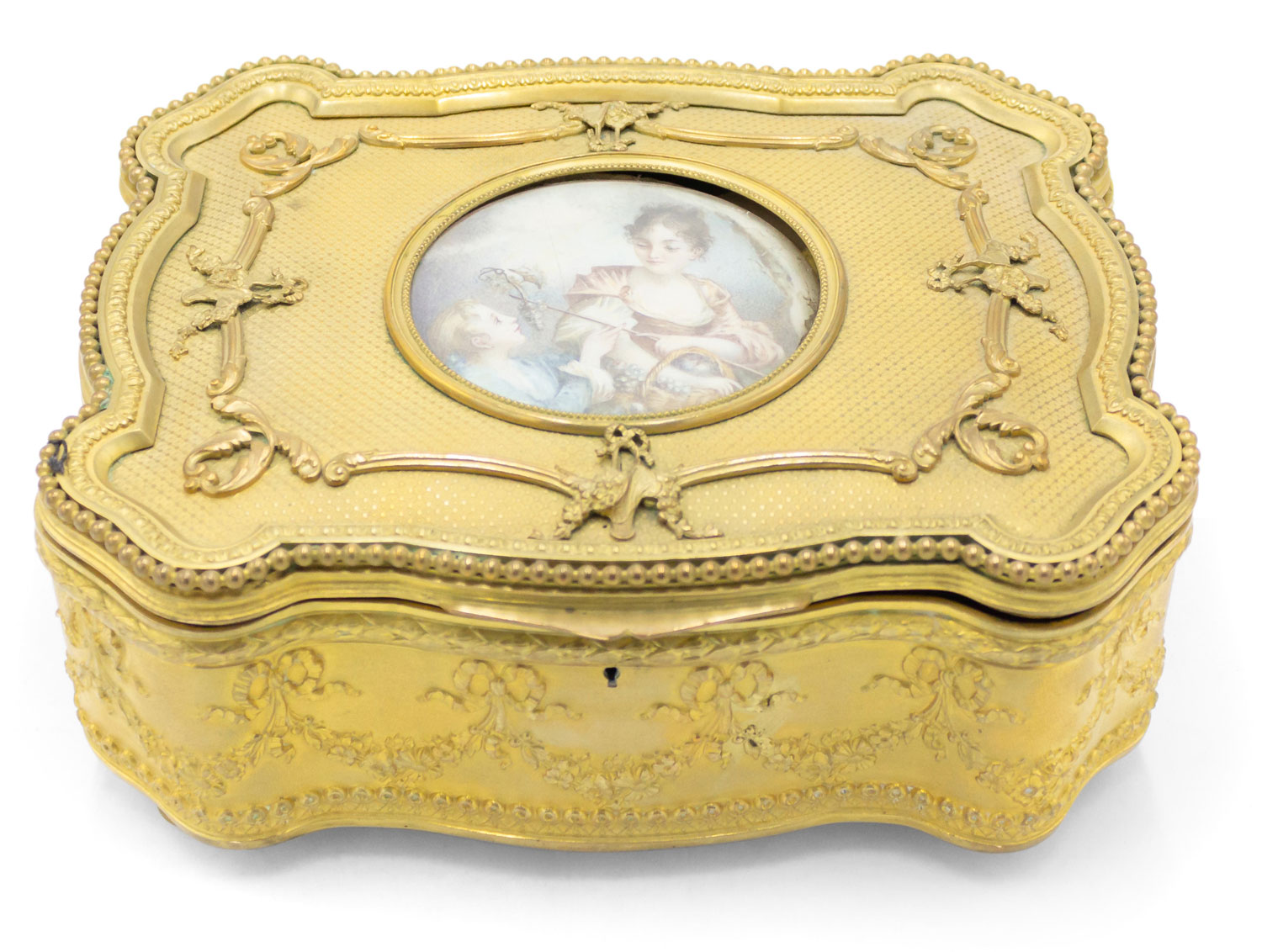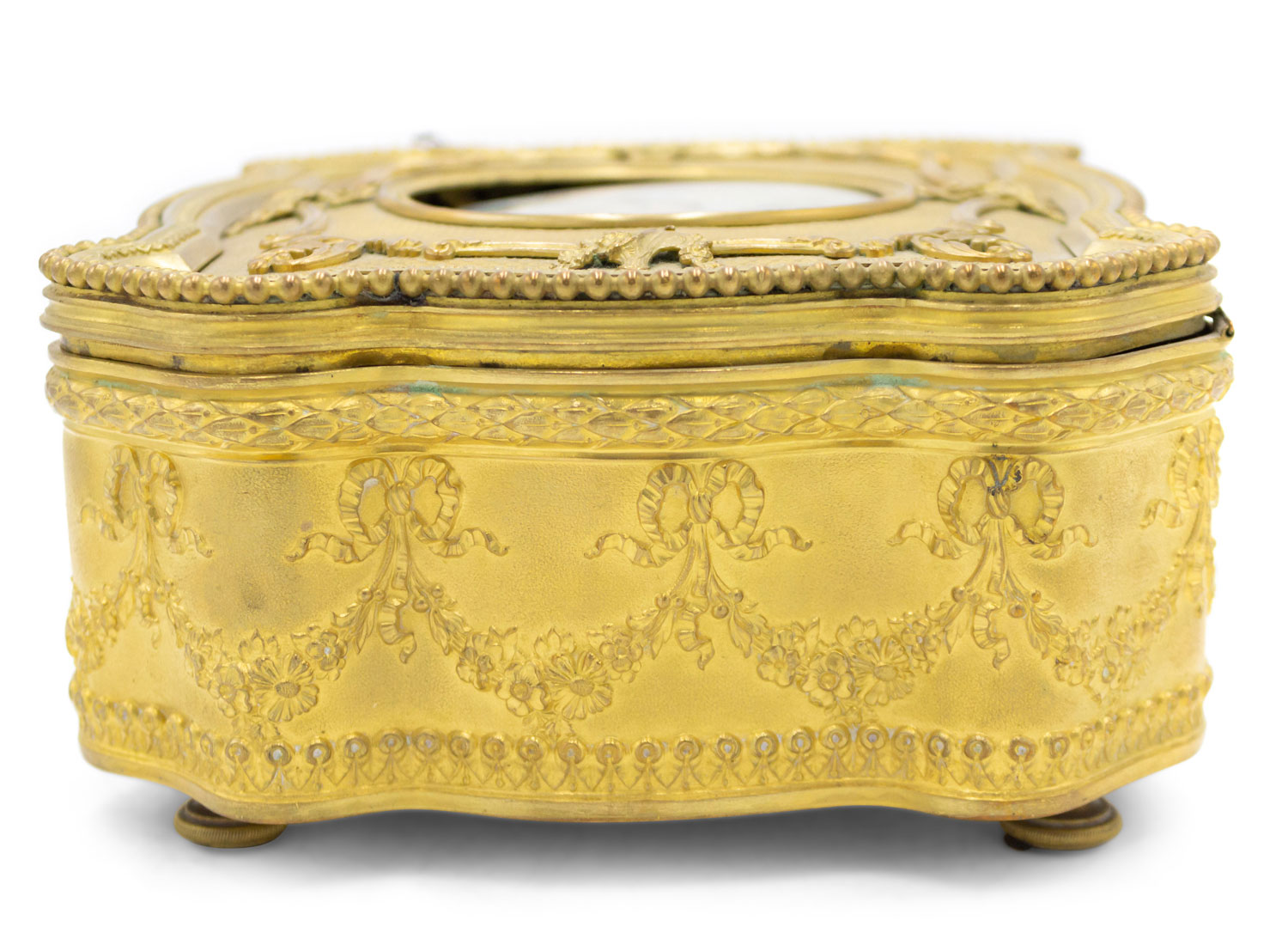 French Louis XVI-style (19/20th Century) bronze dore rectangular shaped jewel box with round plaque of lady and man