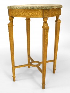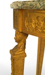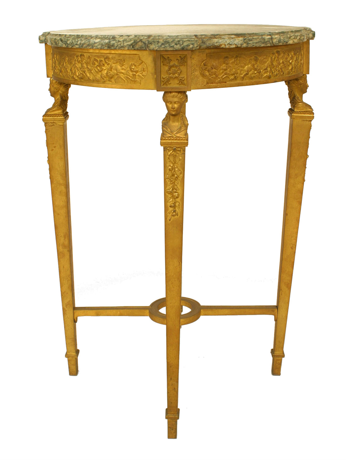 French Louis XVI-style (19th Century) bronze dore 4 legged end table with female heads, stretcher, and green marble top..