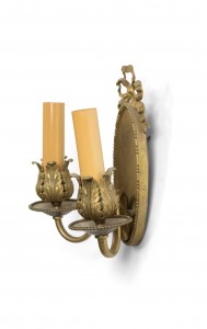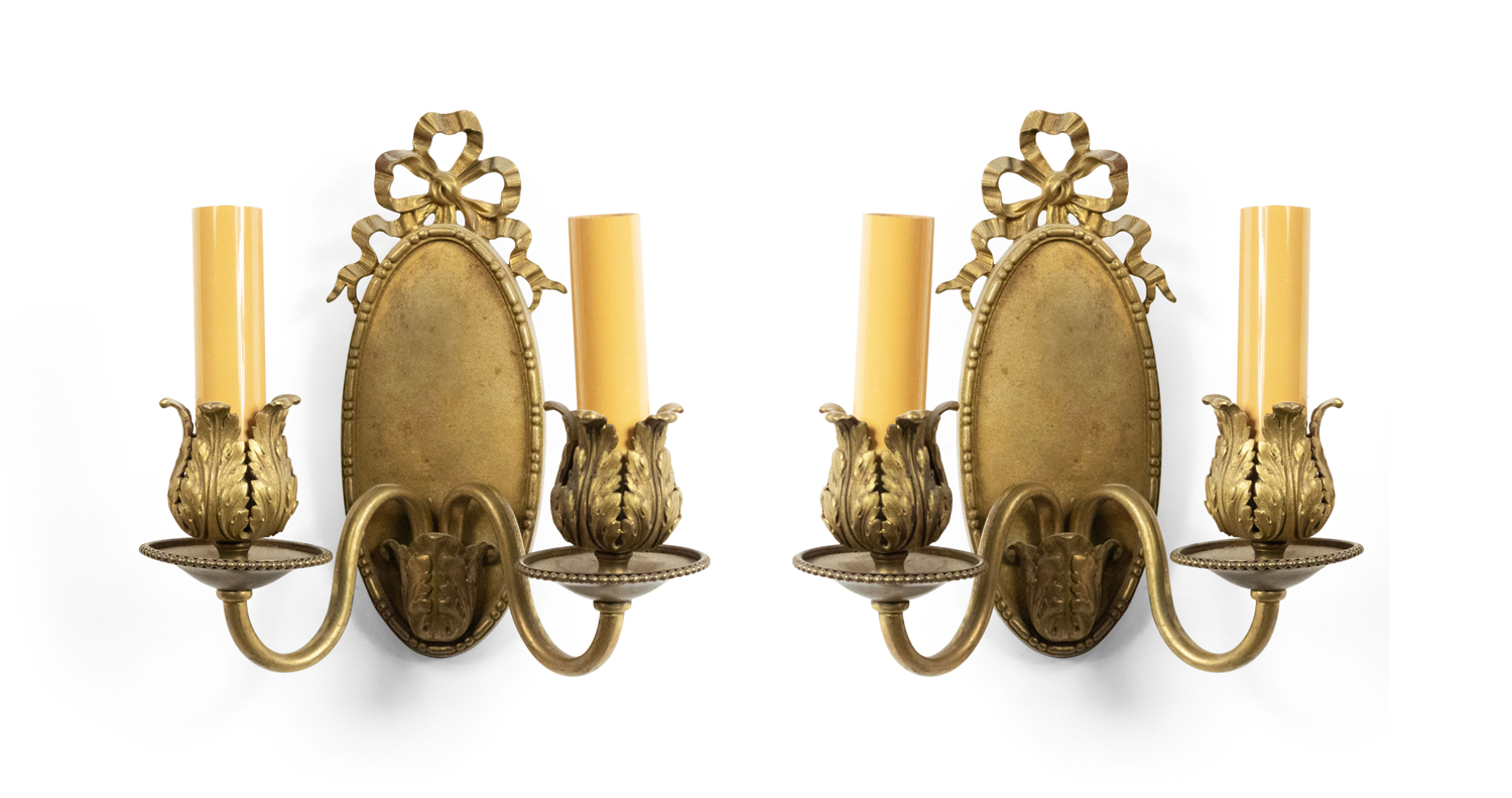 PAIR of French Louis XVI-style (20th Century) bronze dore wall sconces with oval backs, two arms, and bow knot tops. (PRICED AS PAIR)