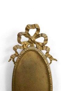 PAIR of French Louis XVI-style (20th Century) bronze dore wall sconces with oval backs, two arms, and bow knot tops. (PRICED AS PAIR).