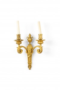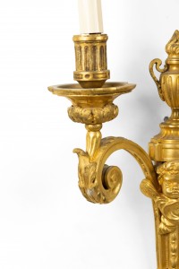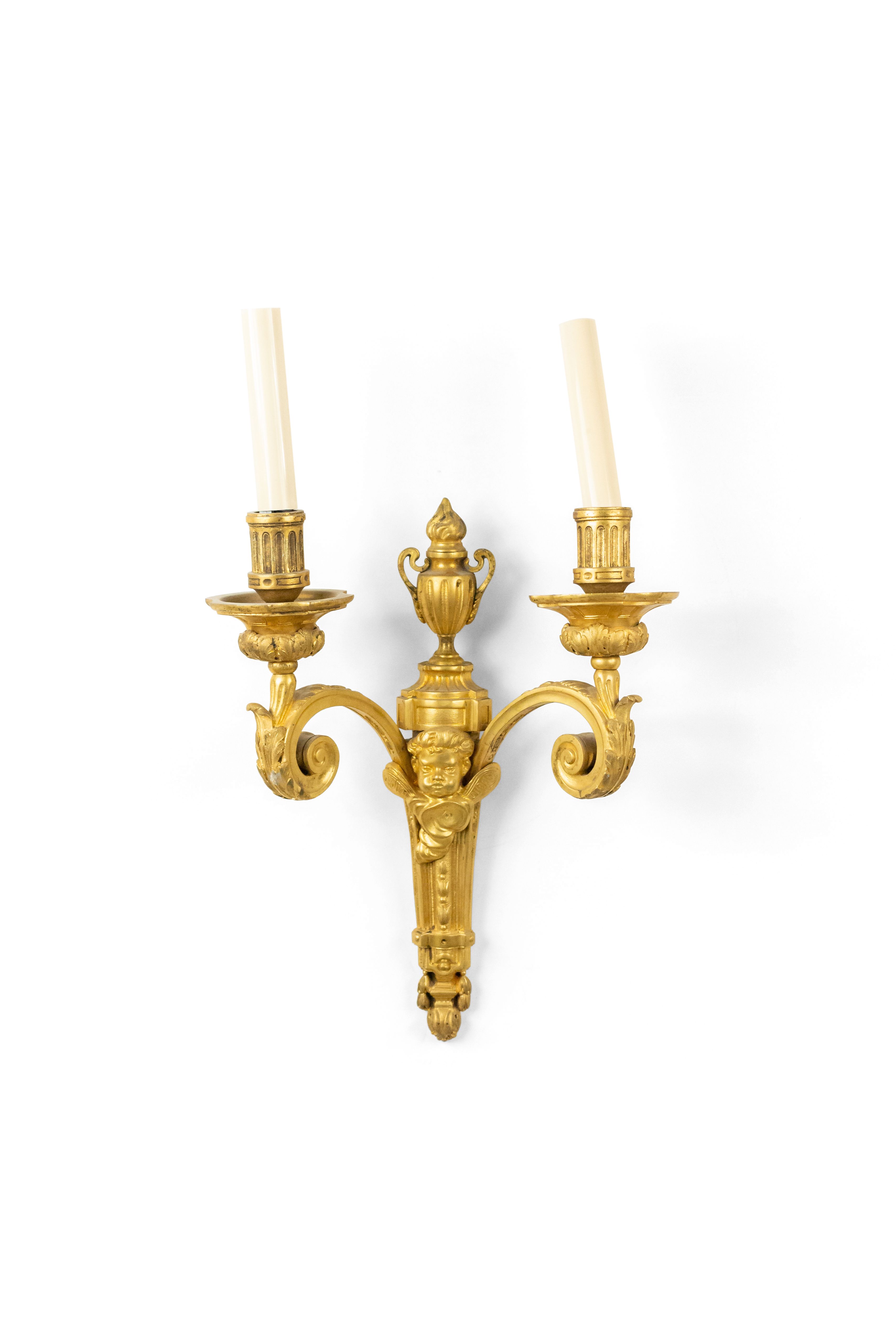 French Louis XVI-style (19th Century) bronze dore wall sconce with two scroll arms, cupid head ornament, and urn-shaped top.