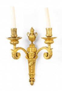 French Louis XVI-style (19th Century) bronze dore wall sconce with two scroll arms, cupid head ornament, and urn-shaped top..