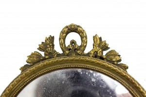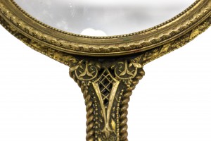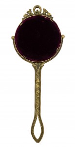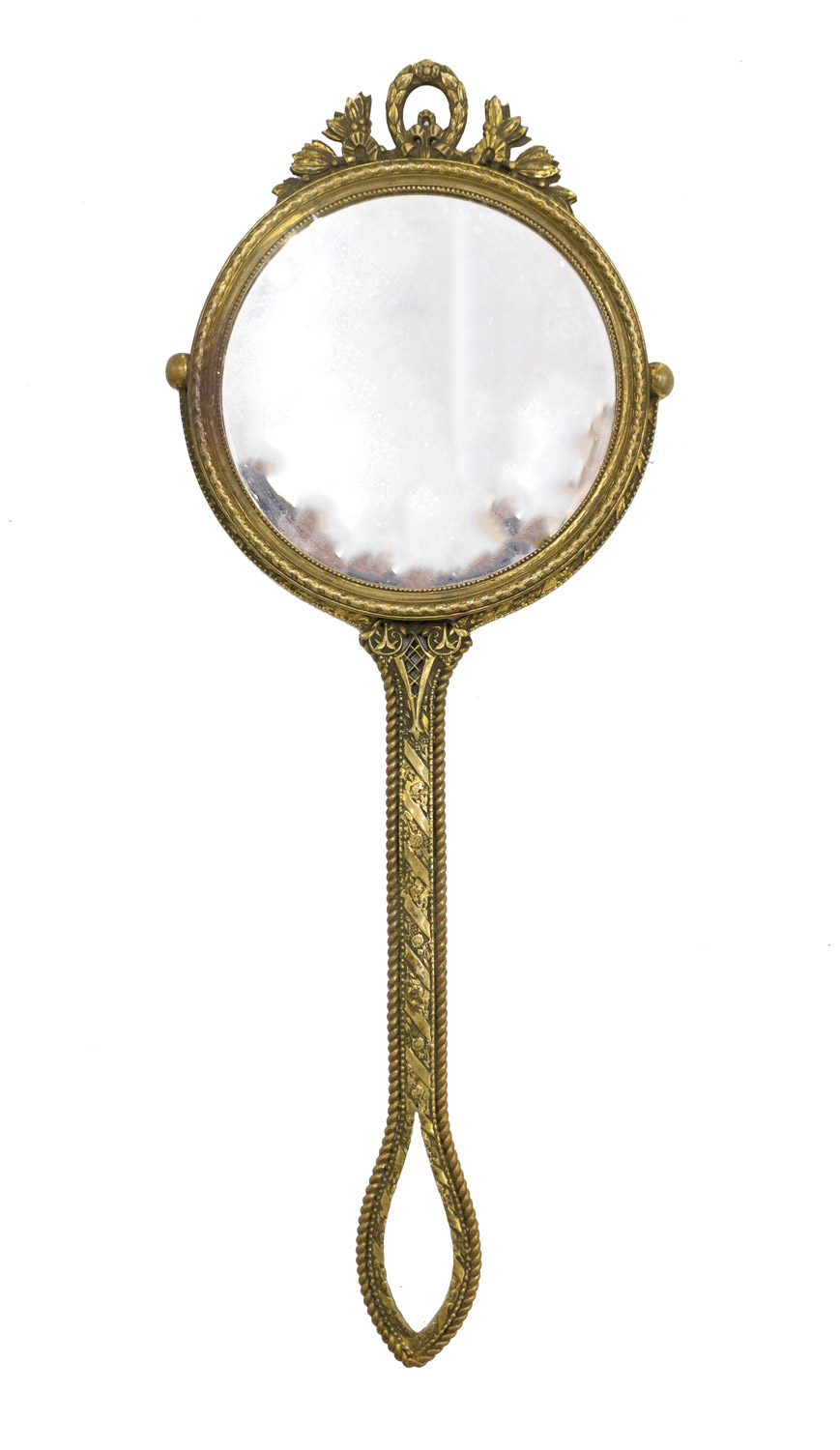 French Louis XVI style (19th Cent) bronze hand mirror with wreath top and round velvet backing
