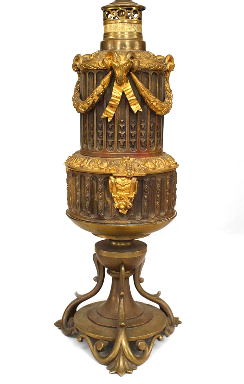 PAIR of French Louis XVI style (19th Century) bronze and gilt trimmed table lamps with ram heads and festoon (PRICED AS PAIR)..