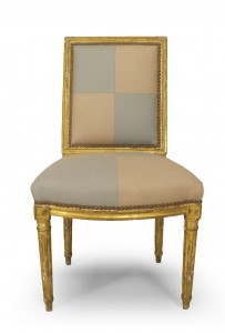 PAIR of French Louis XVI (18th Cent) gilt side chairs with square back and upholstered in beige and blue square pattern on seat and back.