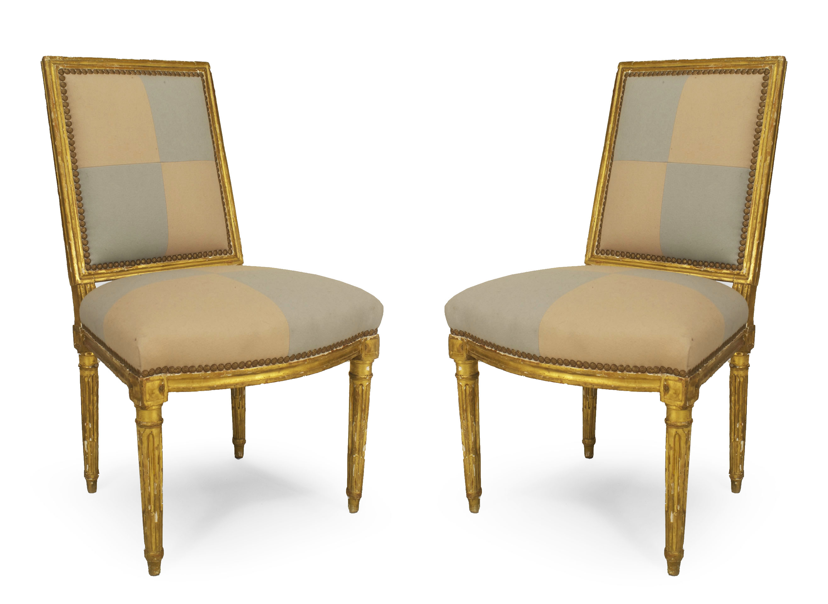 PAIR of French Louis XVI (18th Cent) gilt side chairs with square back and upholstered in beige and blue square pattern on seat and back..