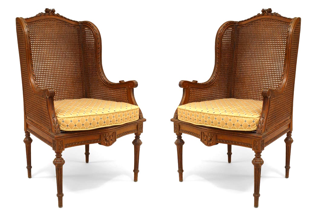 PAIR of French Louis XVI style (19th Cent) oak wing chairs with carved frame and cane seat, back and arms with a cushion.