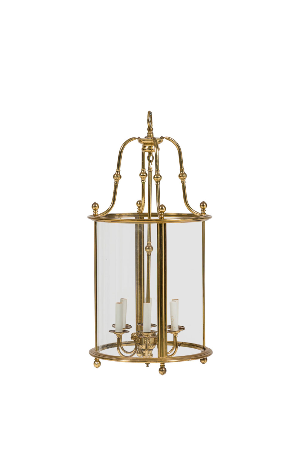 French Louis XVI style brass barrel shaped lantern chandelier encased in 4 rounded glass panes with 6 lights emanating from the center stem ("AS IS" -2 glass panels missing).