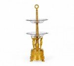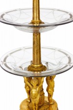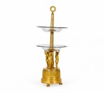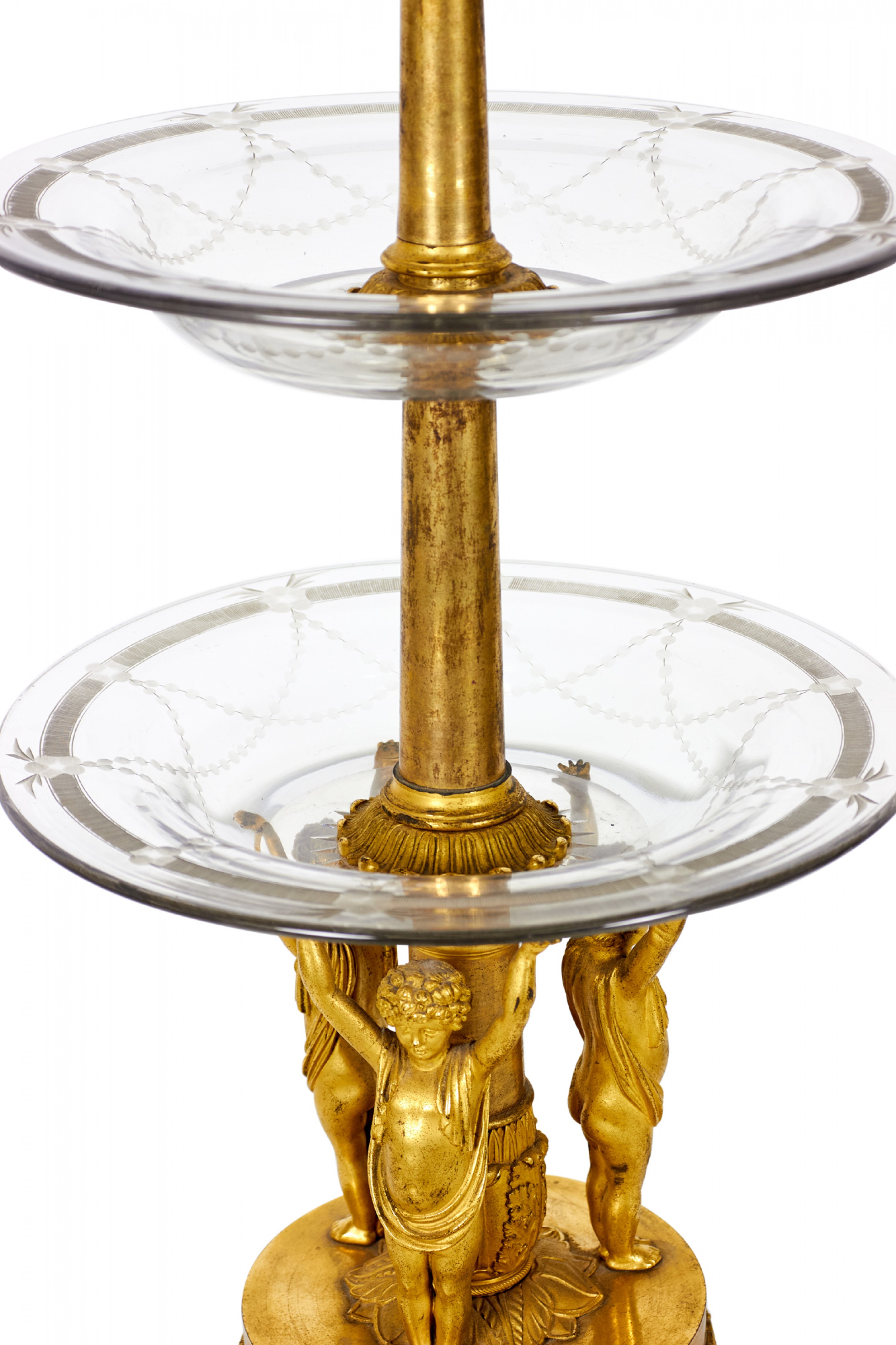 French Louis XVI-style (19th Century) bronze dore centerpiece with 3 cupids holding 2 etched glass tiers with wreath top.