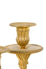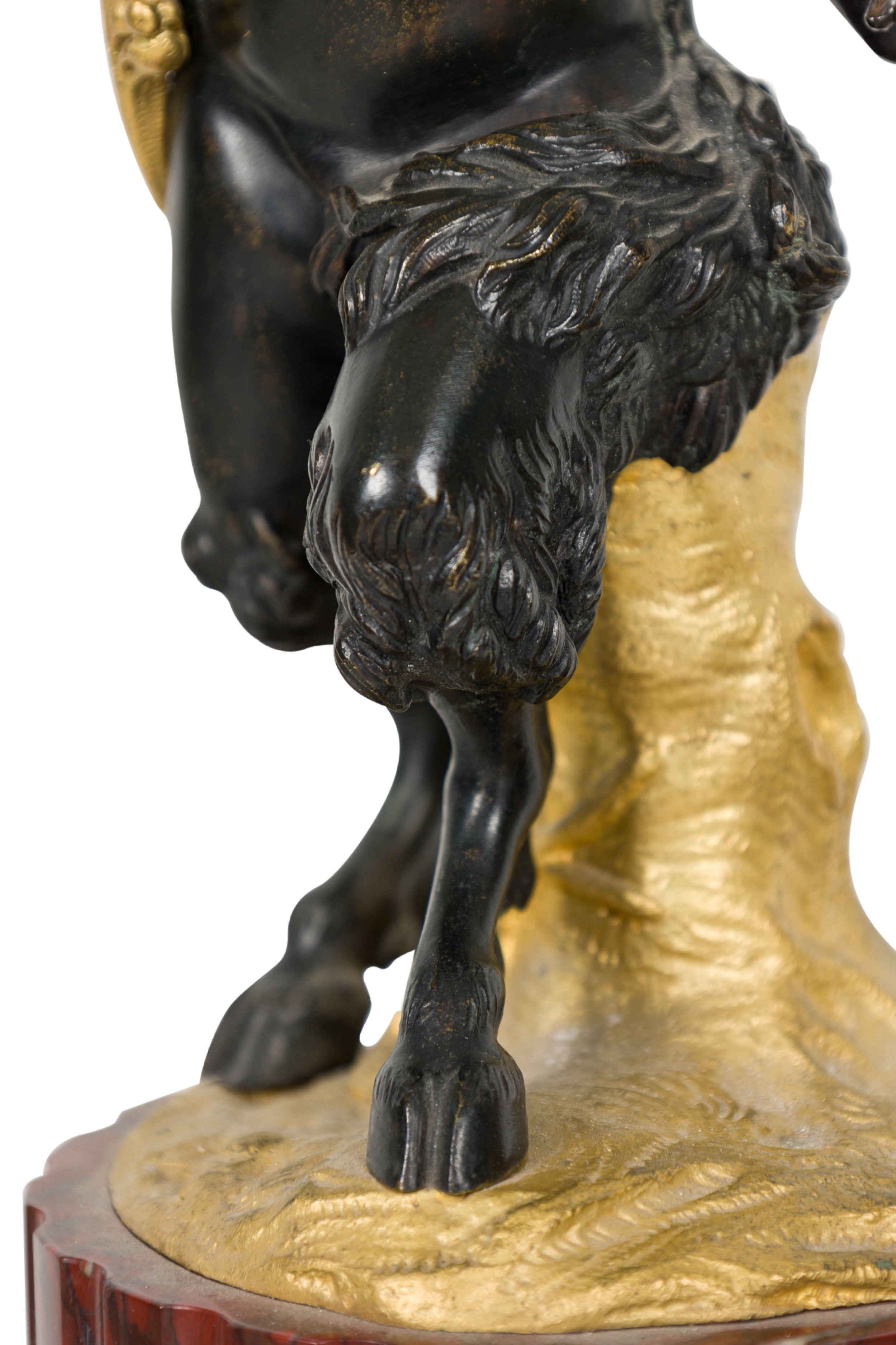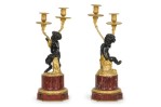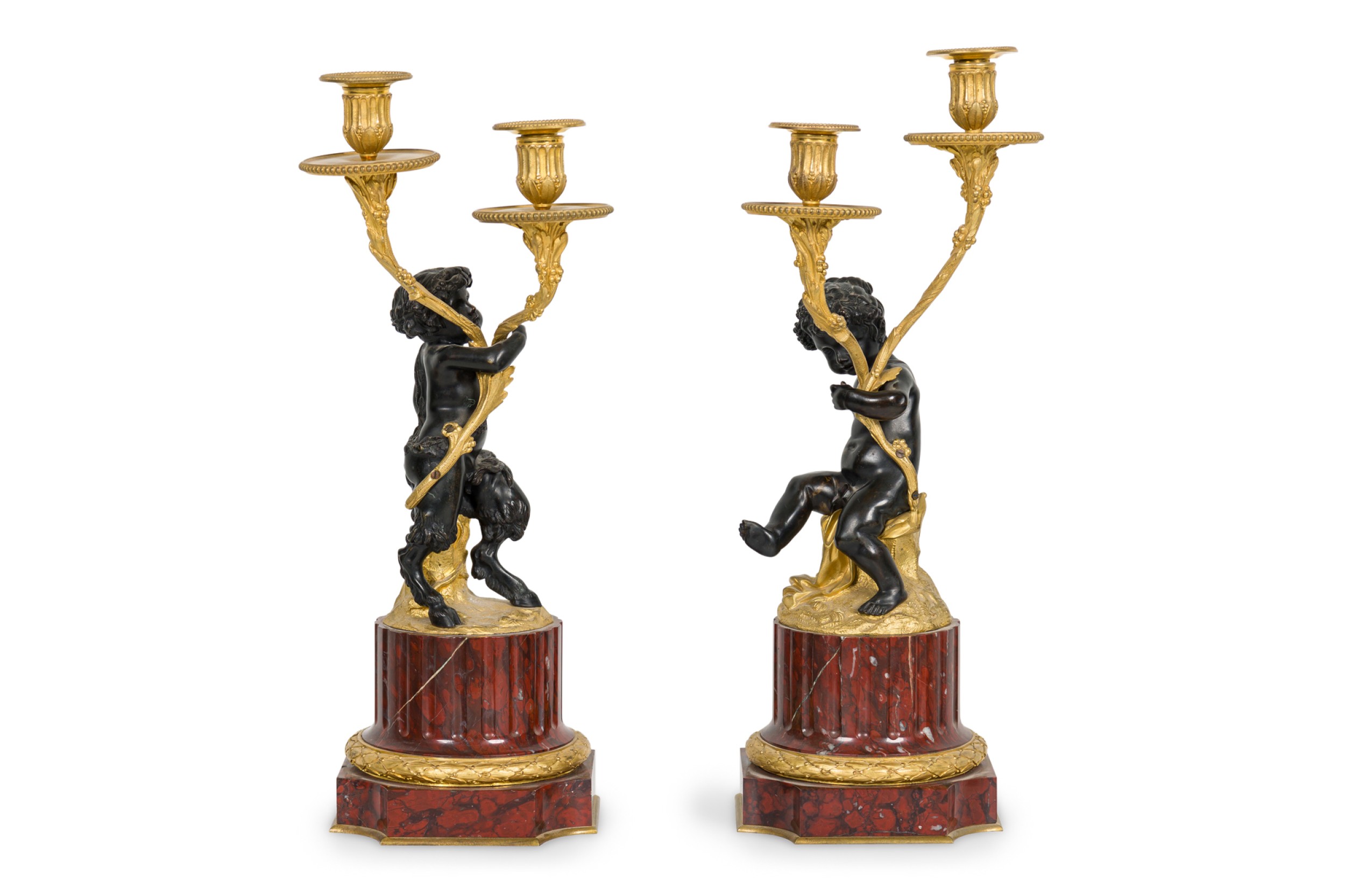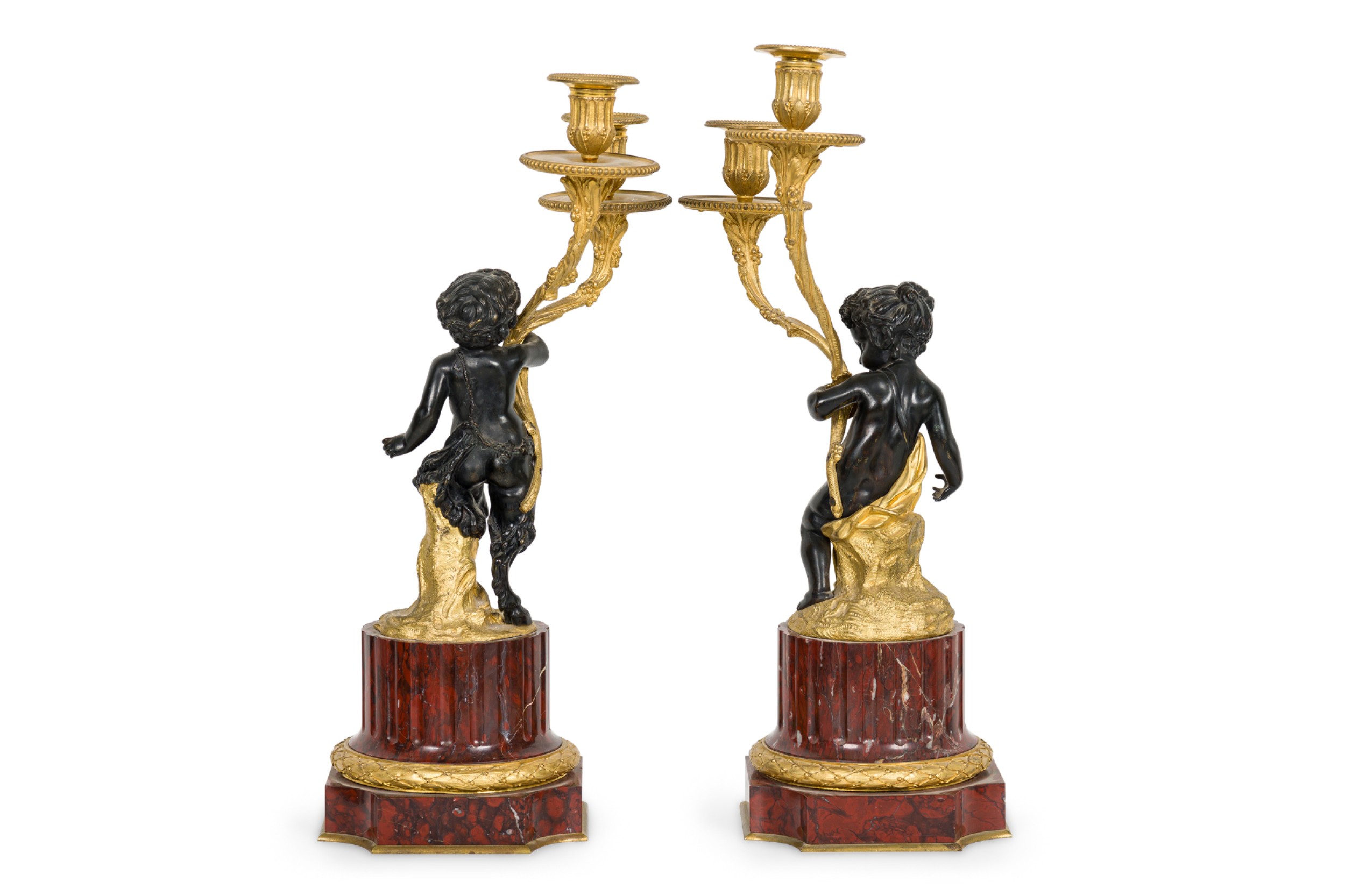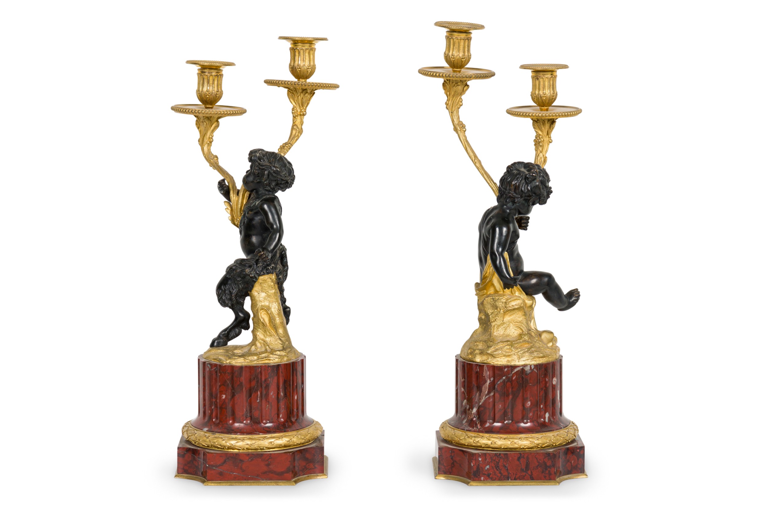 PAIR of French Louis XVI-style (19th Century) gilt and patinated bronze candelabra with a cupid/satyr figure holding 2 foliate arms and raised on rouge marble bases (PRICED AS PAIR).