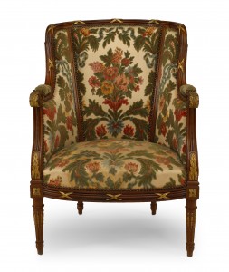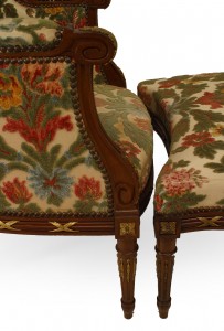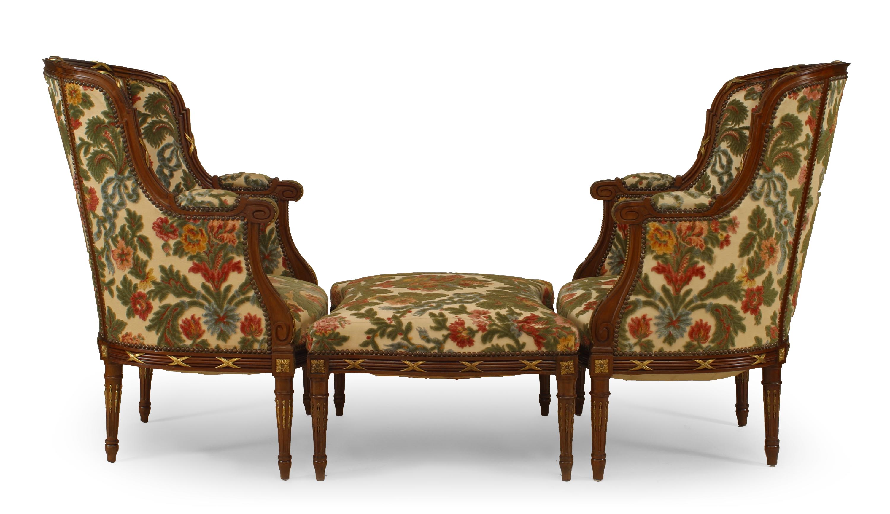 3-Piece Set of French Louis XVI-style (20th Century) bergeres with floral cut velvet tapestry upholstery with matching ottoman (PRICED AS SET).