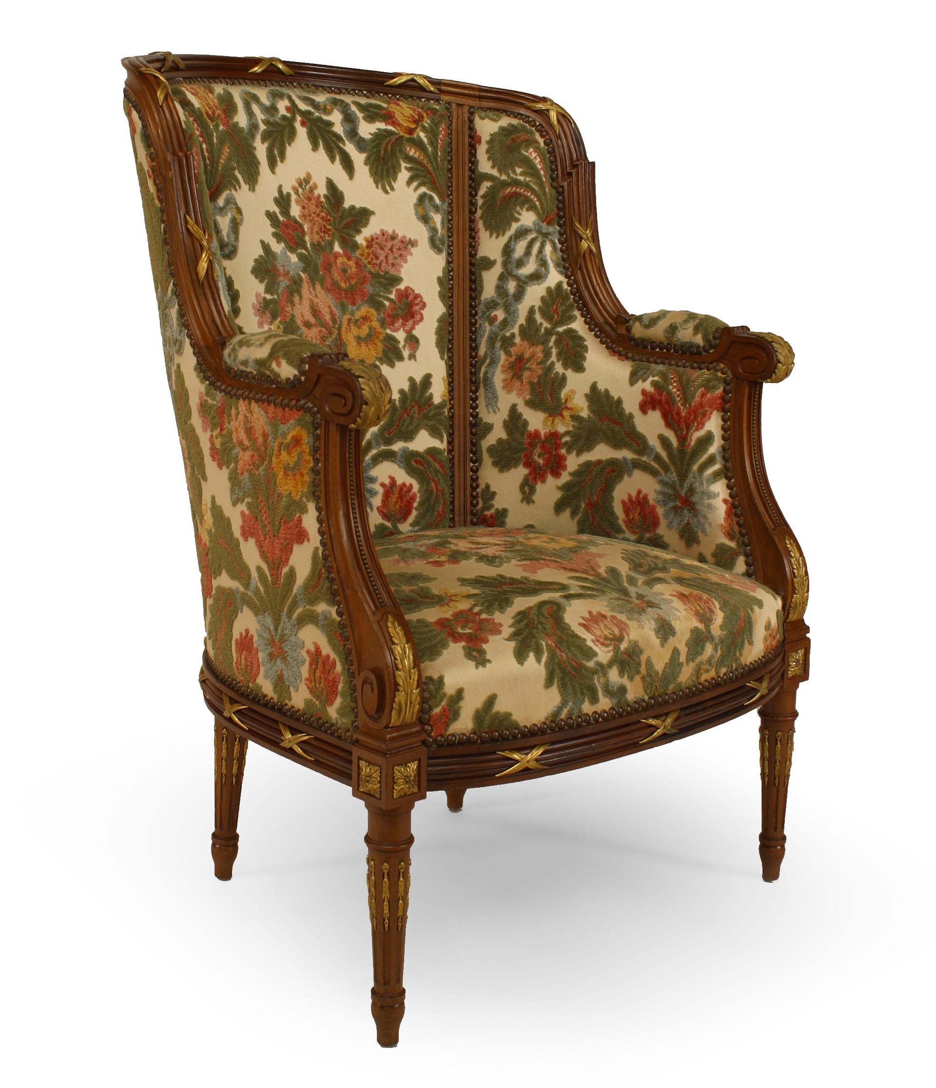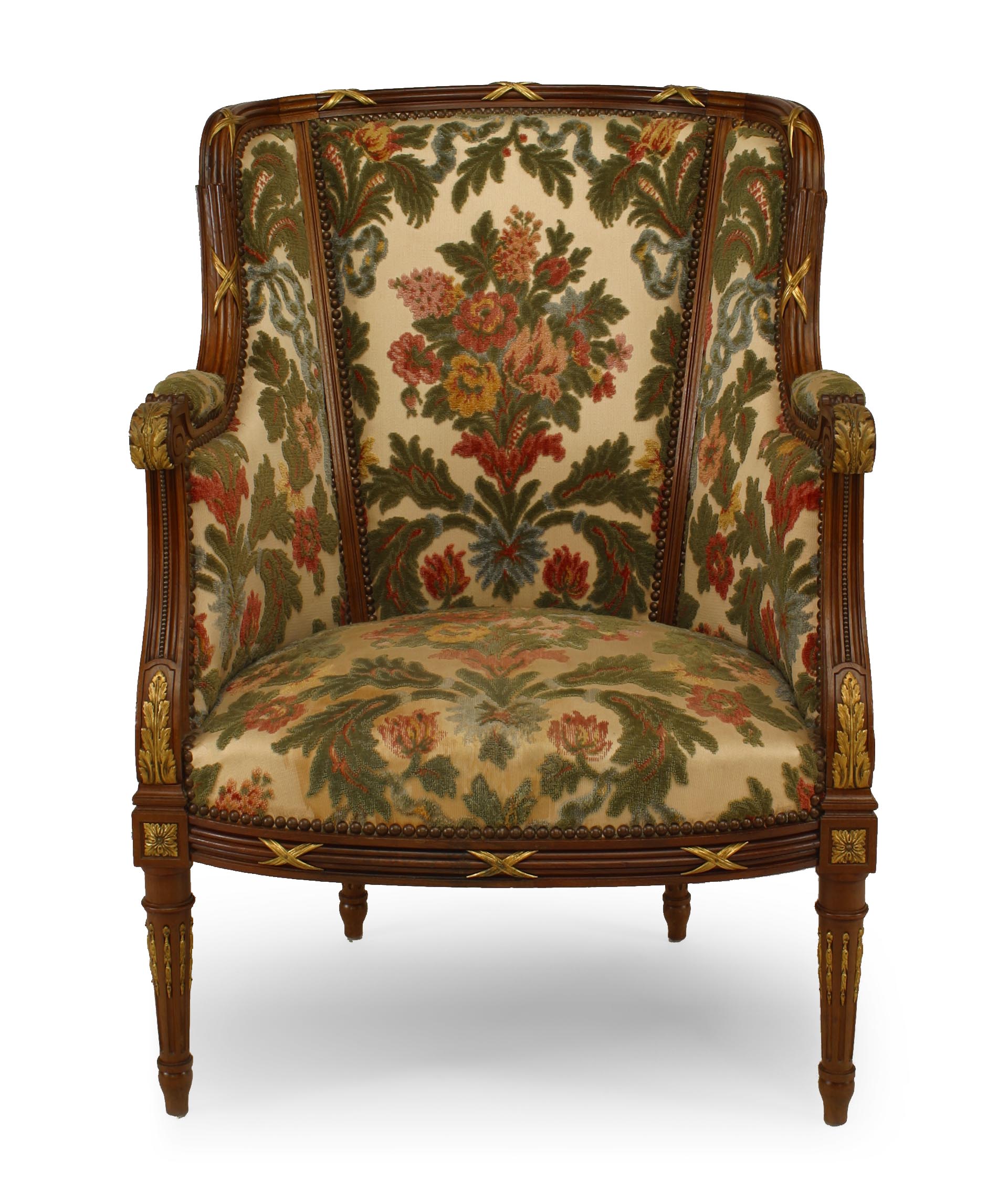 3-Piece Set of French Louis XVI-style (20th Century) bergeres with floral cut velvet tapestry upholstery with matching ottoman (PRICED AS SET)