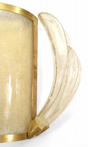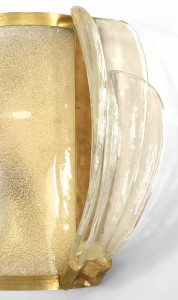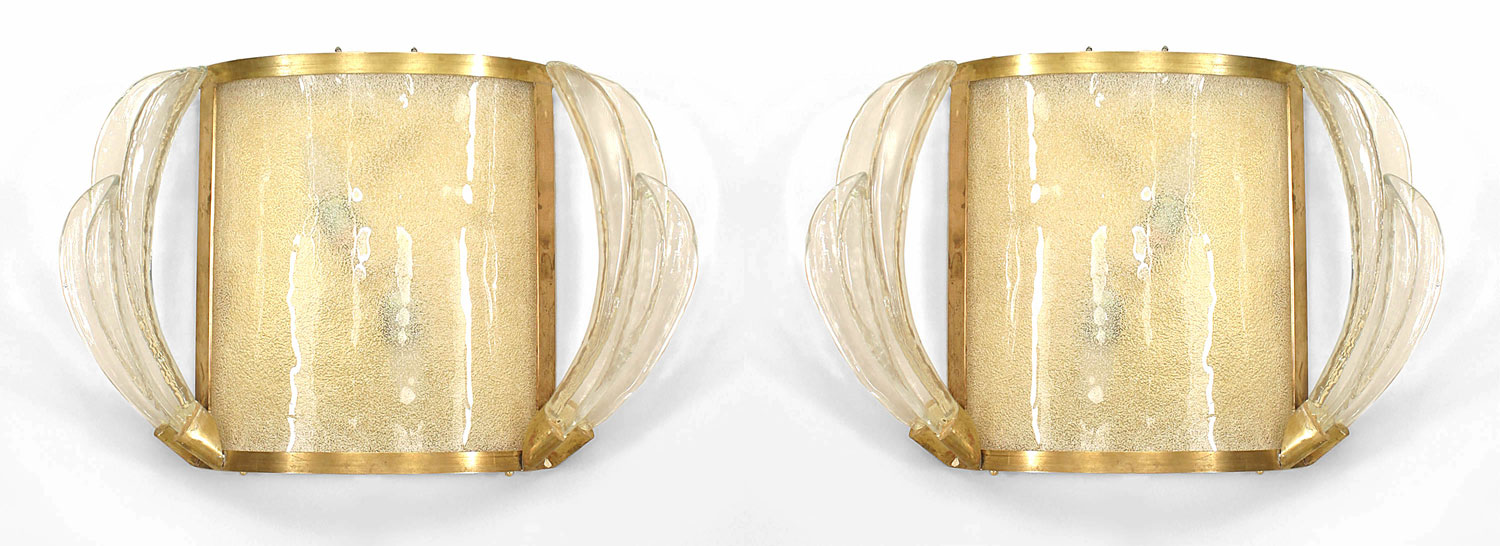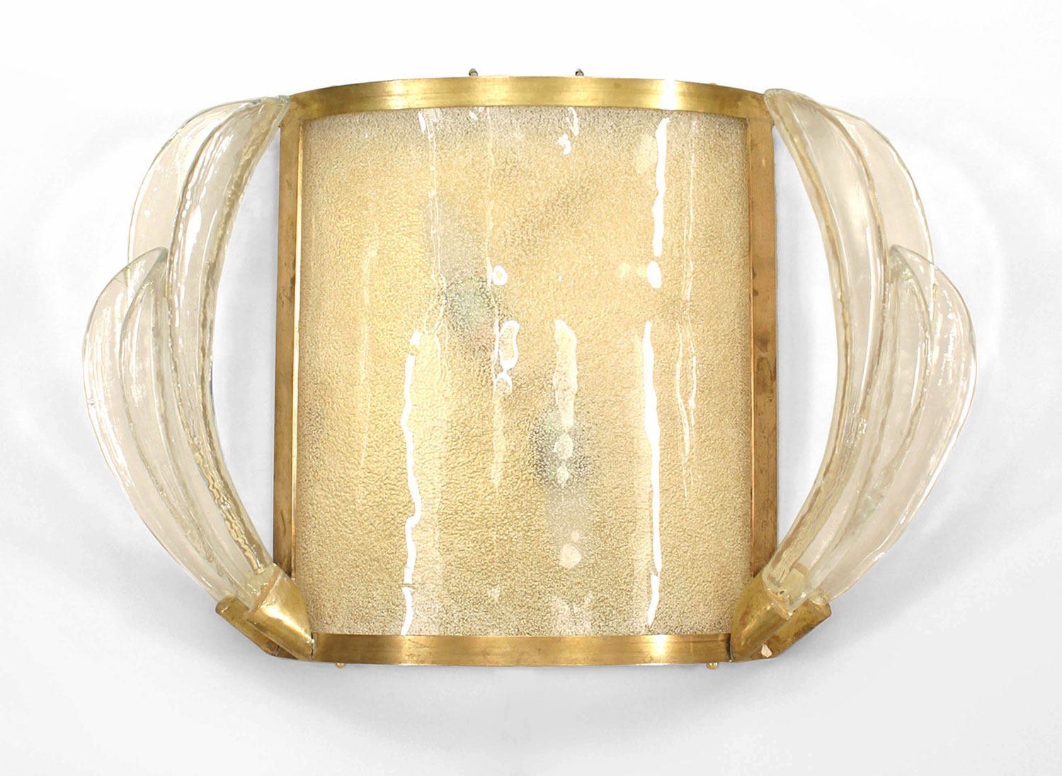 PAIR of French Mid-Century (1940s) brass framed Murano glass wall sconces with double feather design sides with a textured frosted bent glass front panel. (PRICED AS PAIR)