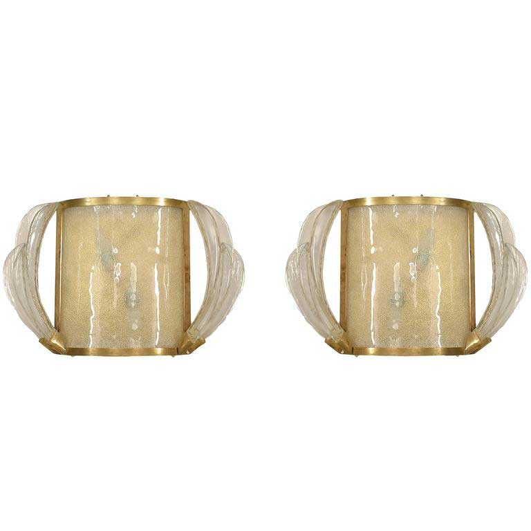 Pair of French Mid-Century Murano Glass and Brass Wall Sconces