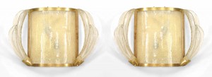 PAIR of French Mid-Century (1940s) brass framed Murano glass wall sconces with double feather design sides with a textured frosted bent glass front panel. (PRICED AS PAIR).