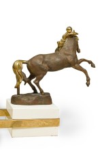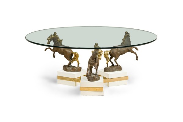 French Modern bronze, patinated bronze and glass low table with three dynamic sculptural horses mount having a round glass top (MAISON CHARLES).