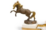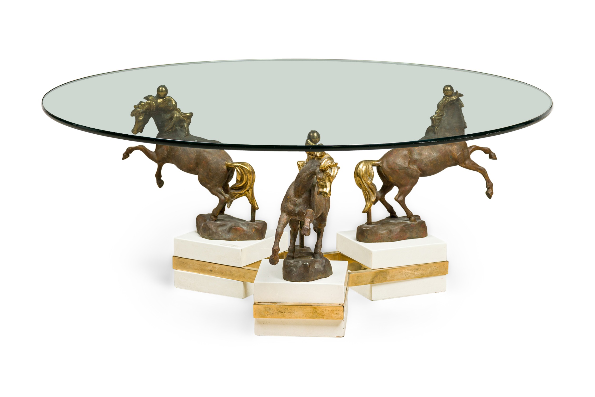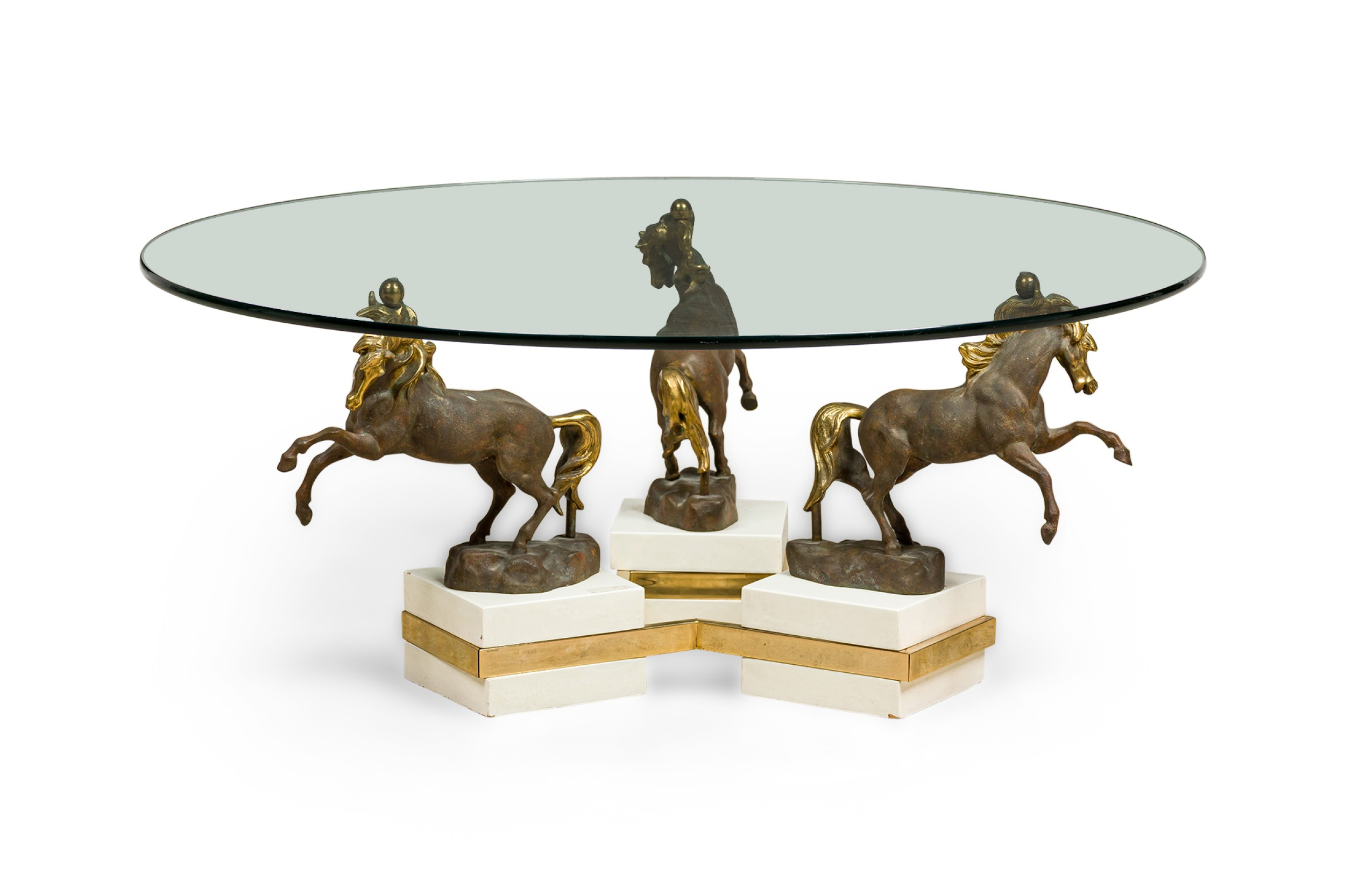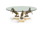 French Modern bronze, patinated bronze and glass low table with three dynamic sculptural horses mount having a round glass top (MAISON CHARLES)