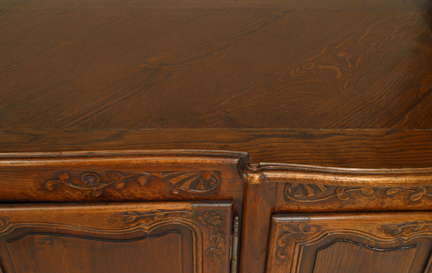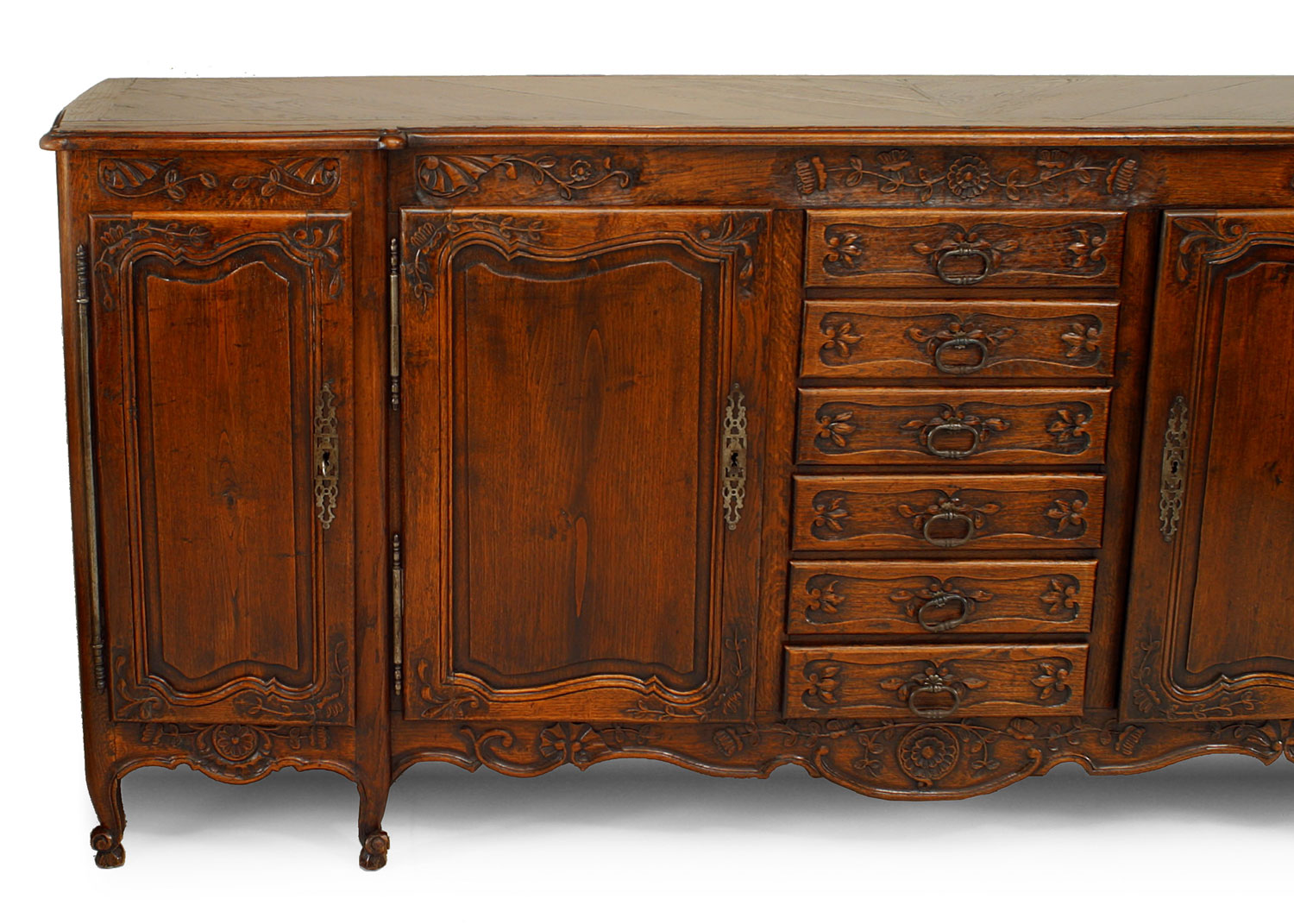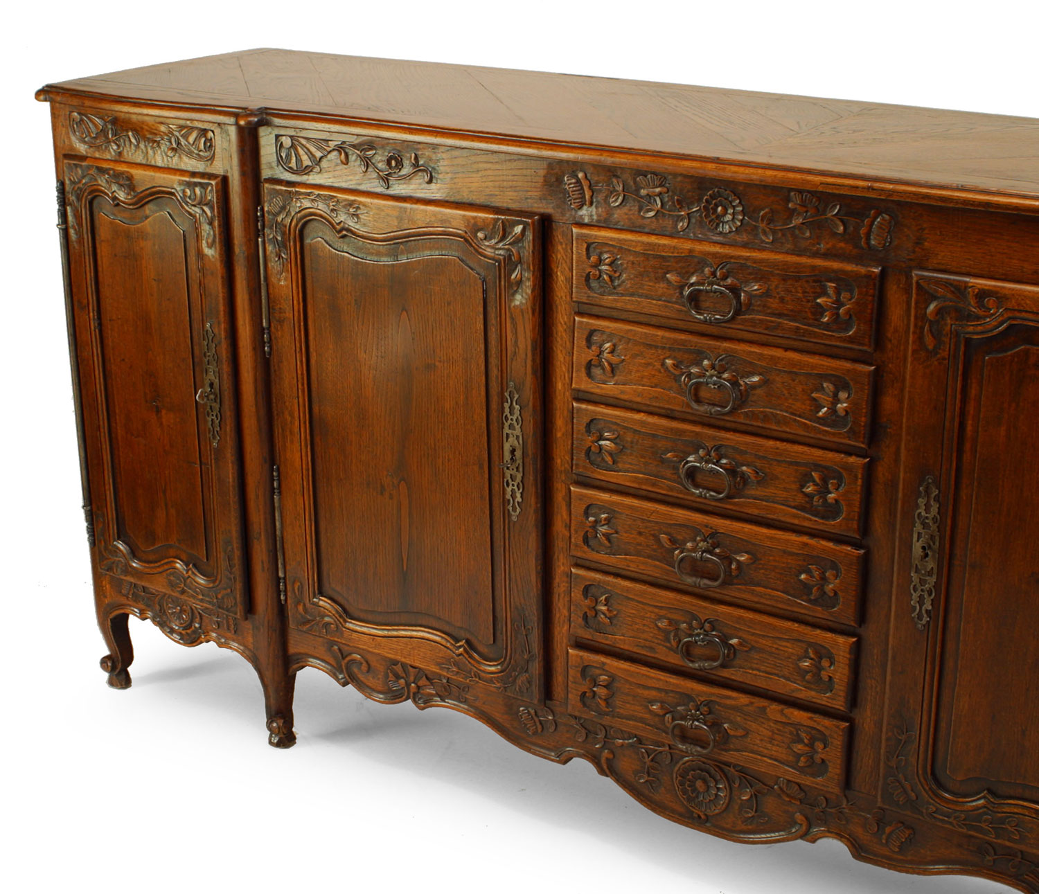 French Provincial Louis XV-style (19th Century) oak buffet cabinet embellished with carved floral trim and designed with 2 pair of side doors and 6 drawers in the center..