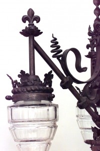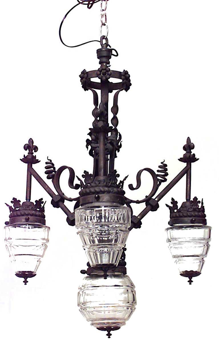 French Provincial-style (19/20th Century) wrought iron 3 arm chandelier with floral decoration and 4 cut glass shades with metal finials.