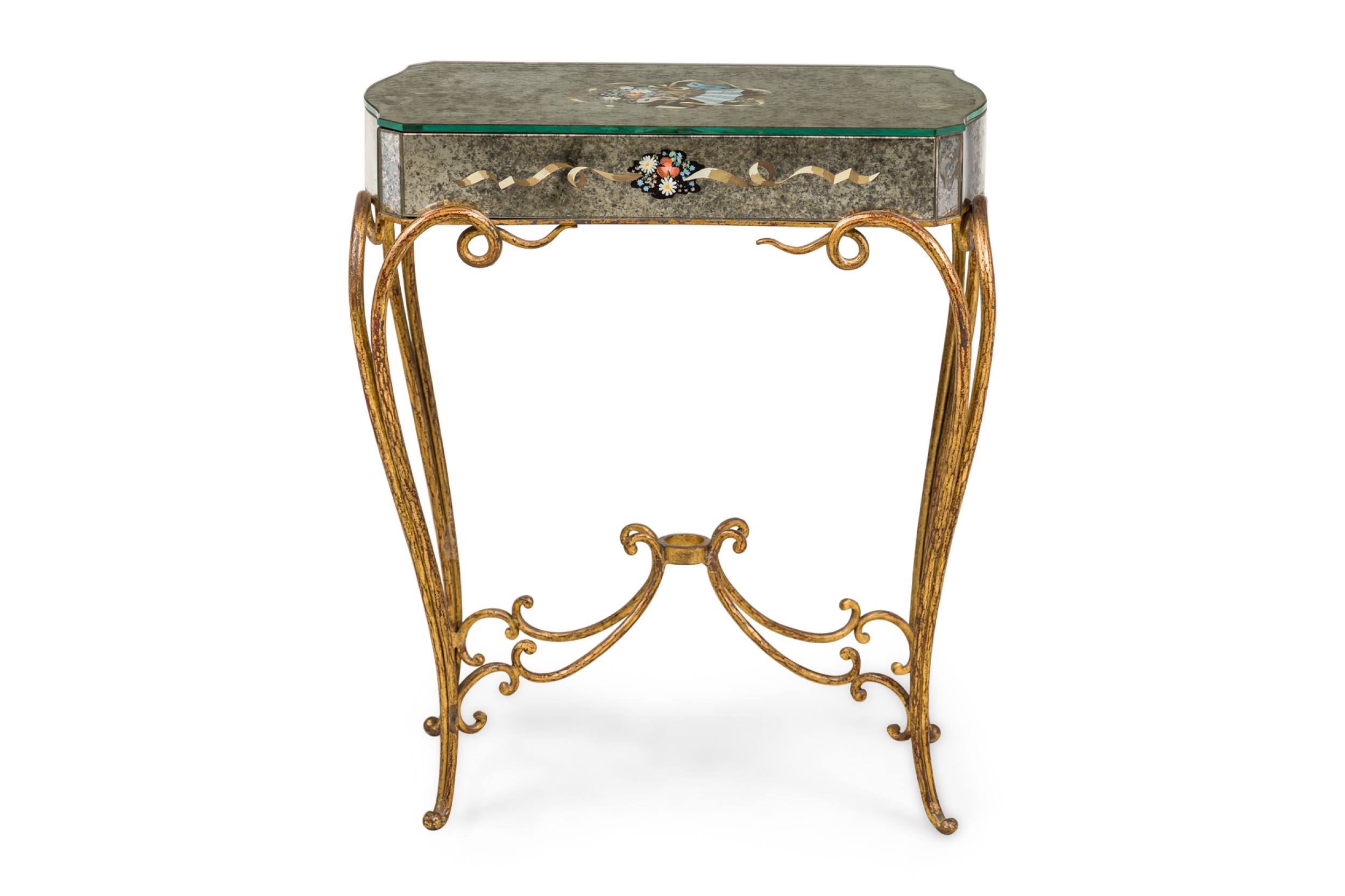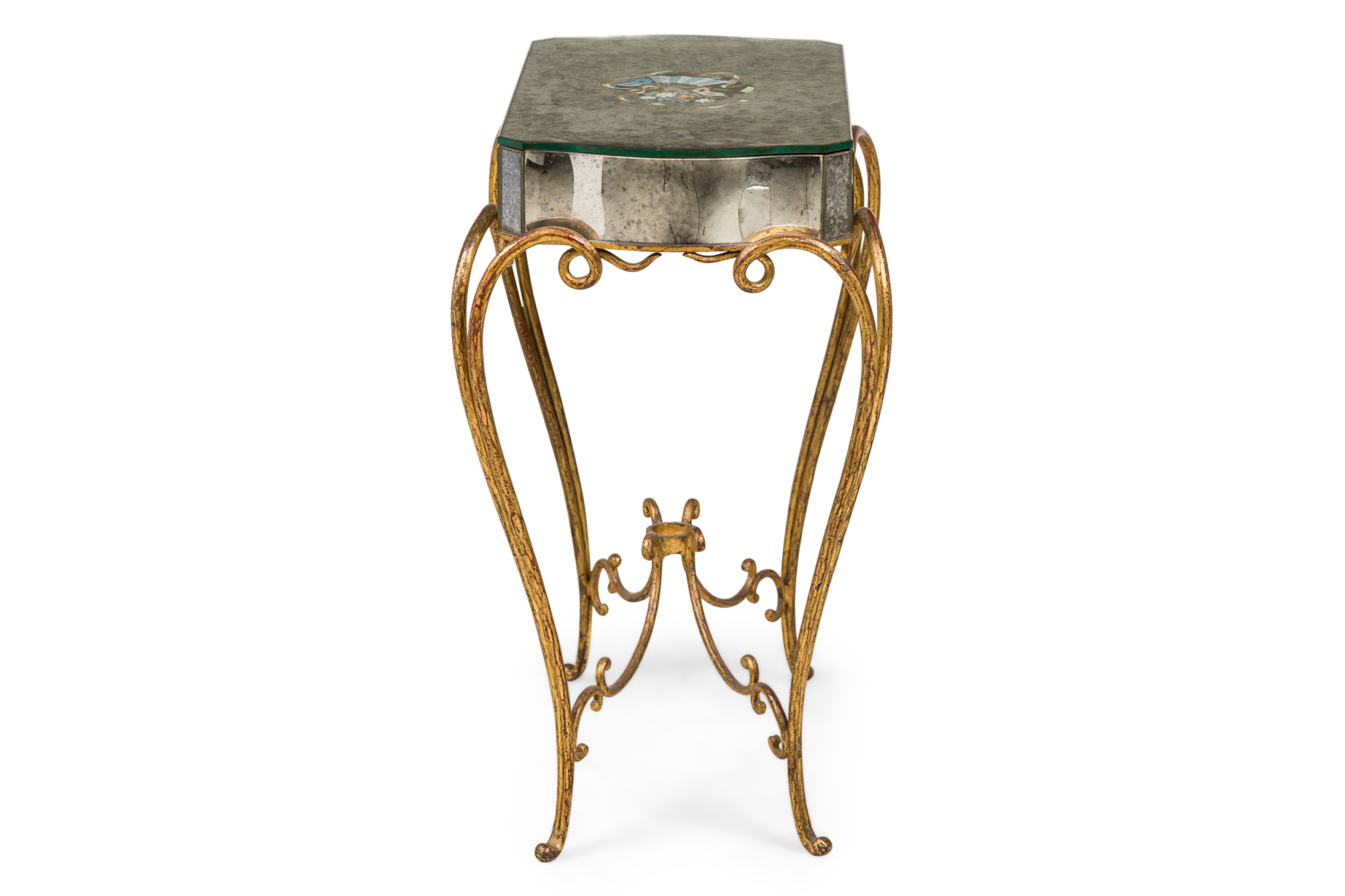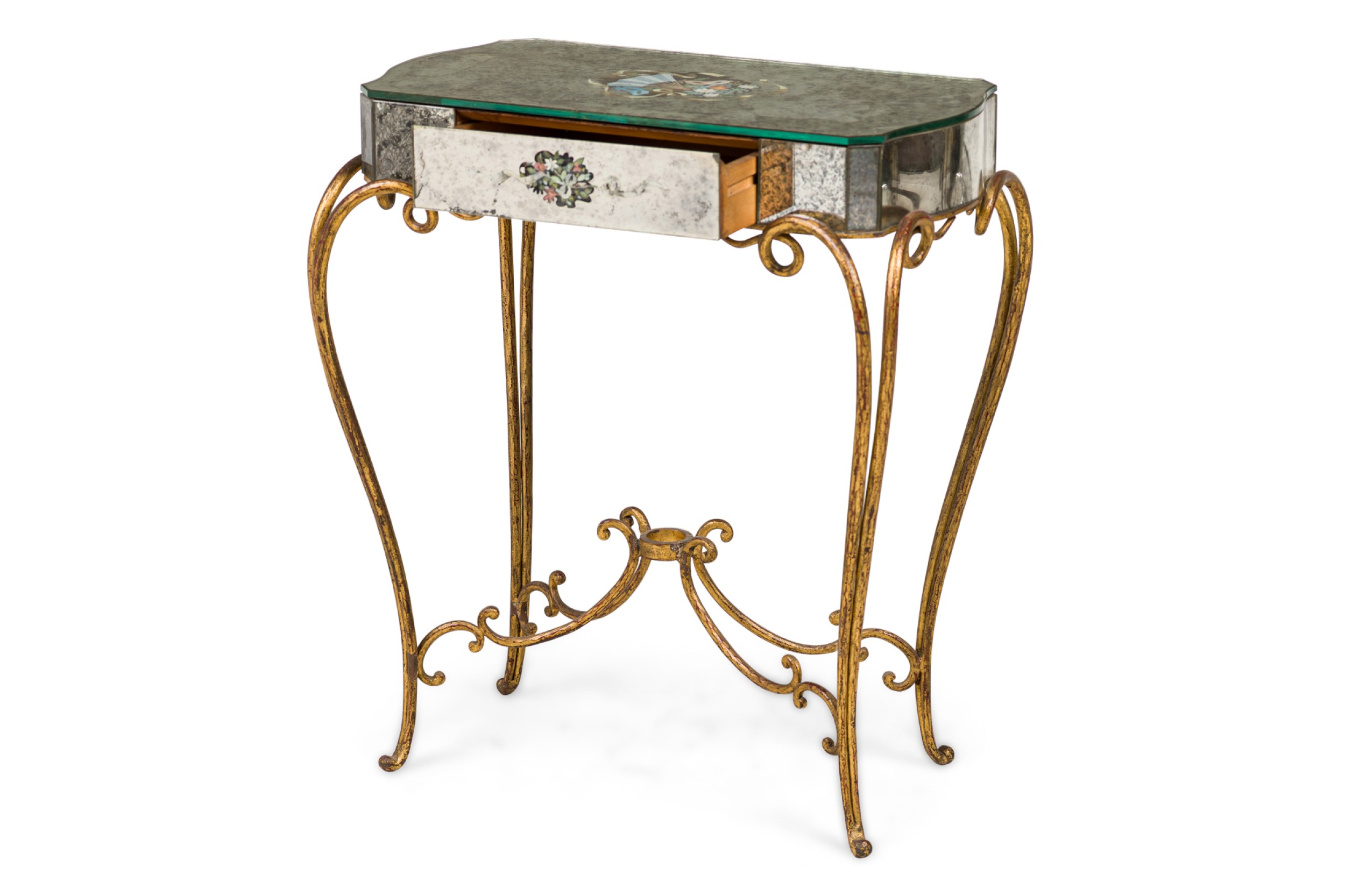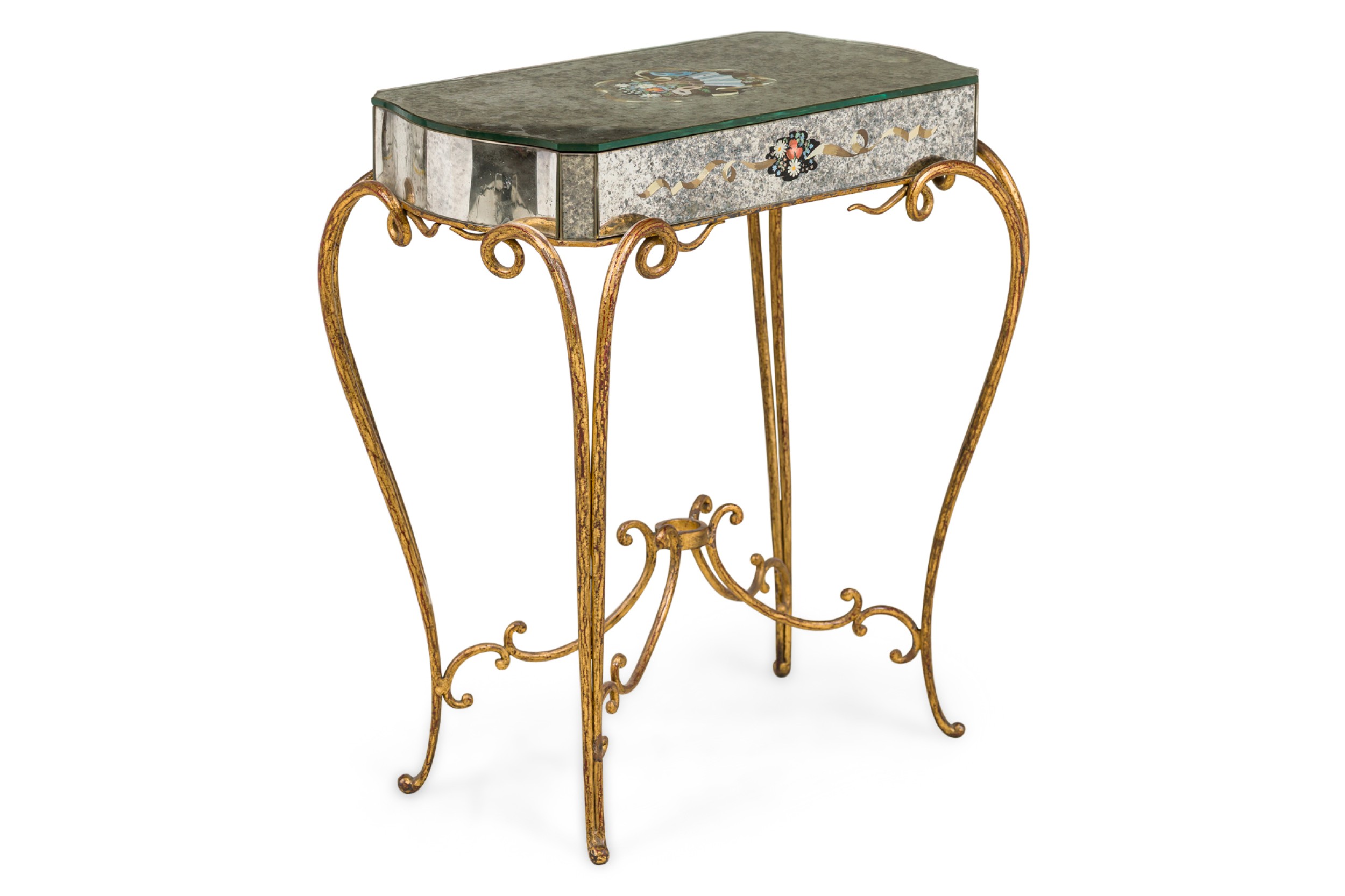 French Mid-Century (1940s) rectangular mirrored decorated end table with drawer and gilt scroll legs and stretcher. (Attributed to RENE DROUET/mirror decorated by ADRIEN EKMAN)