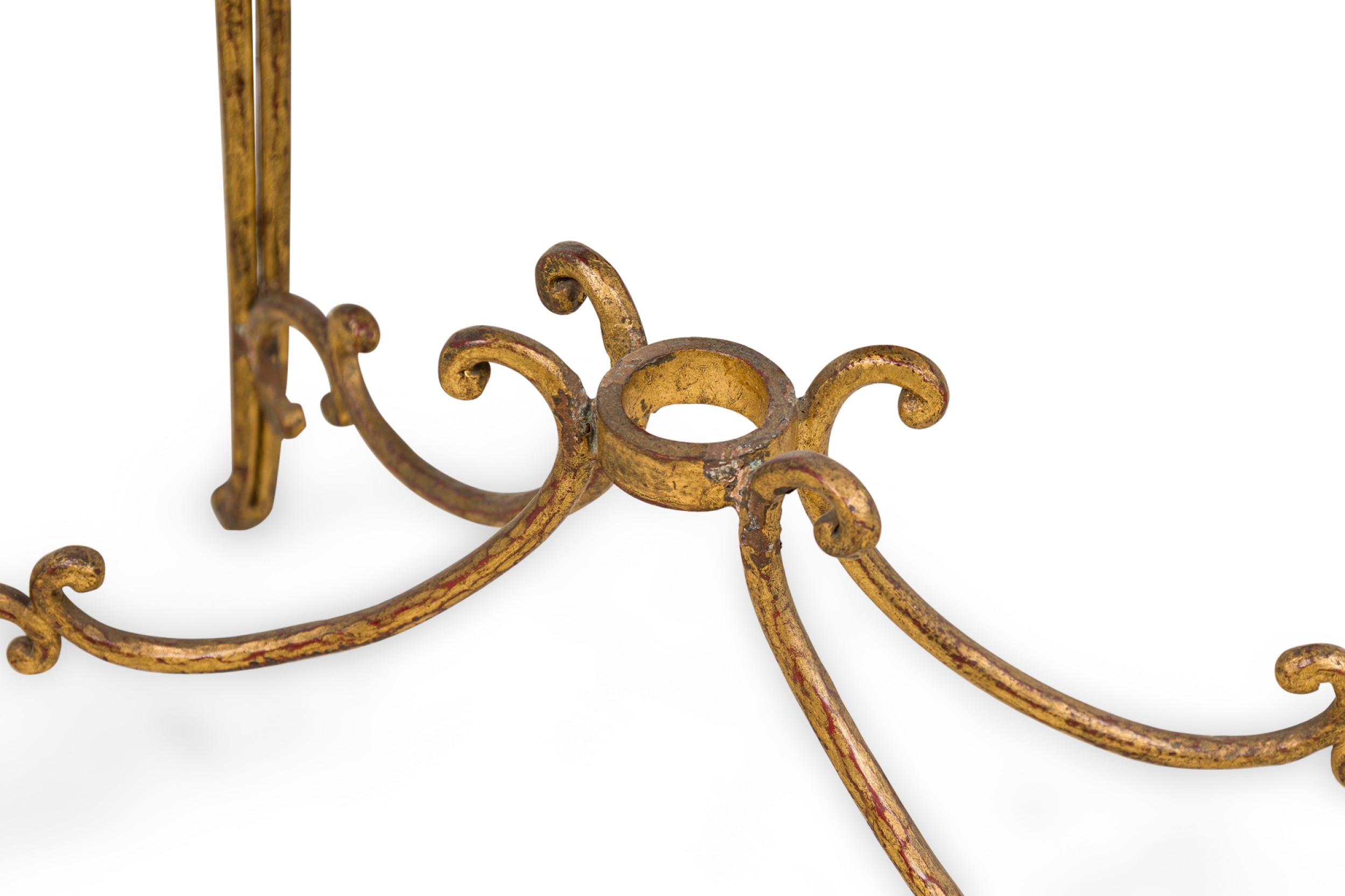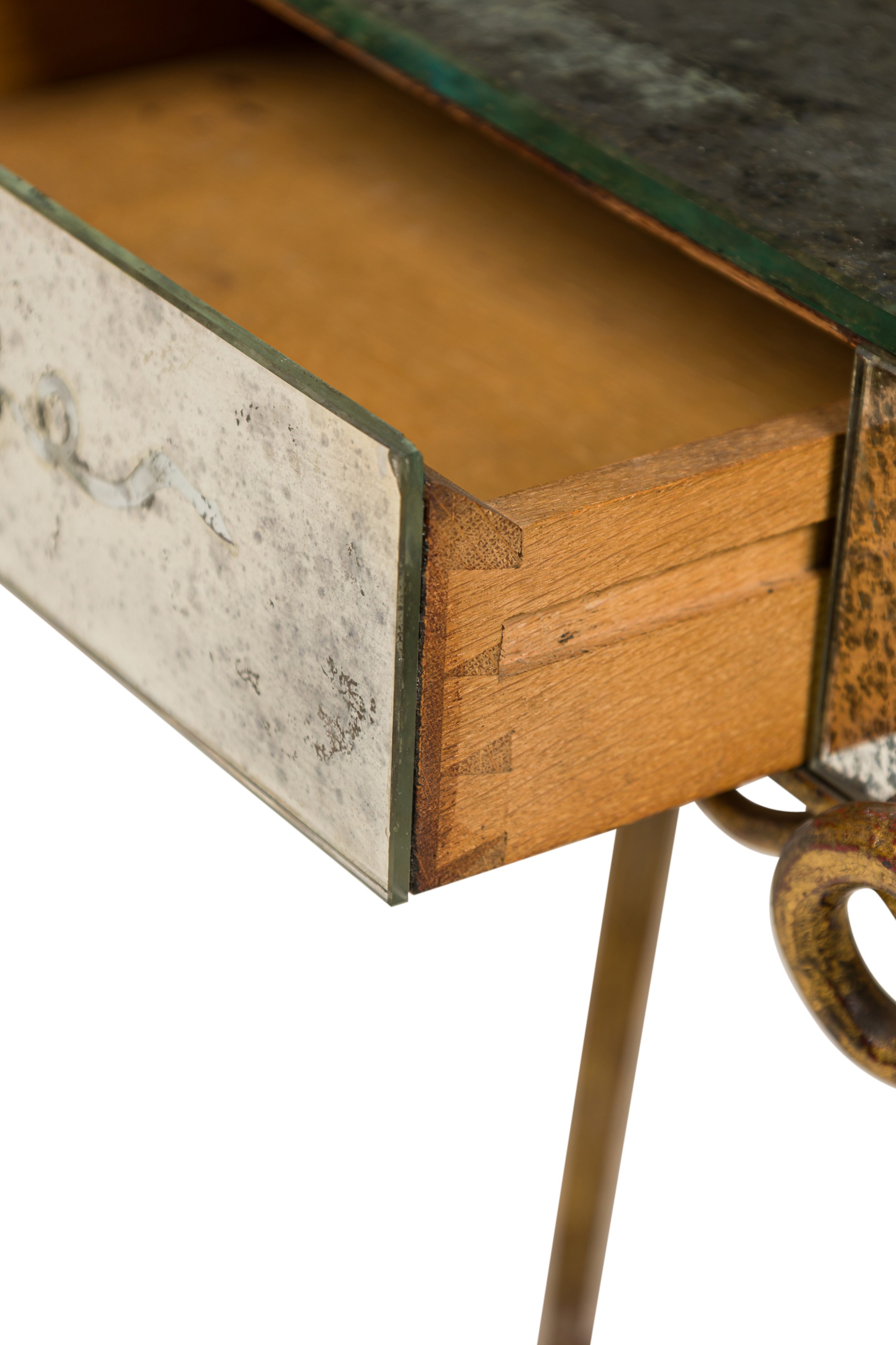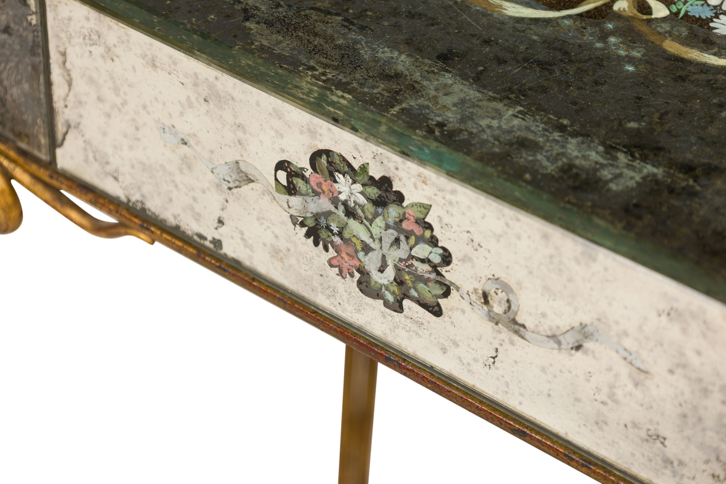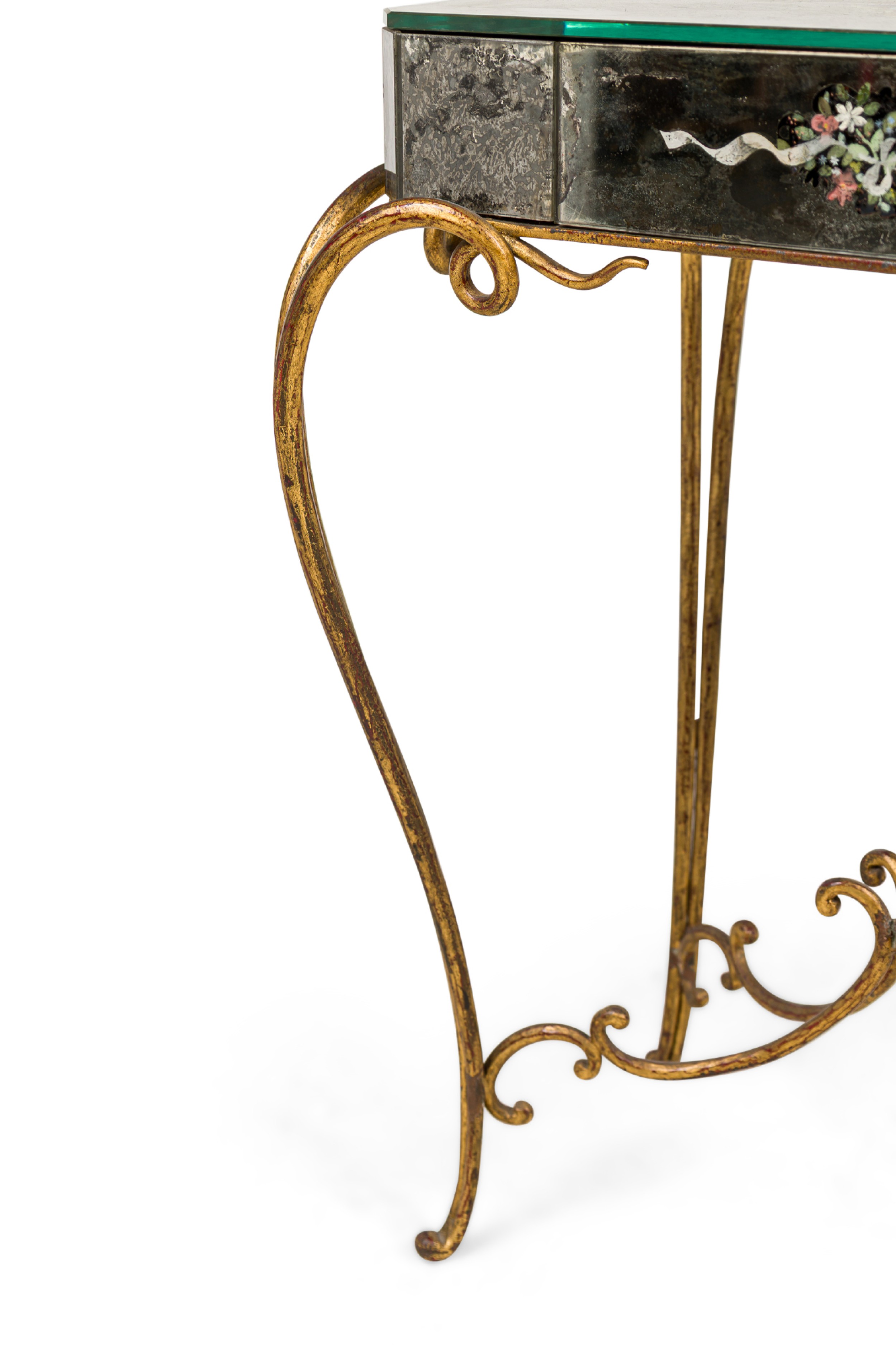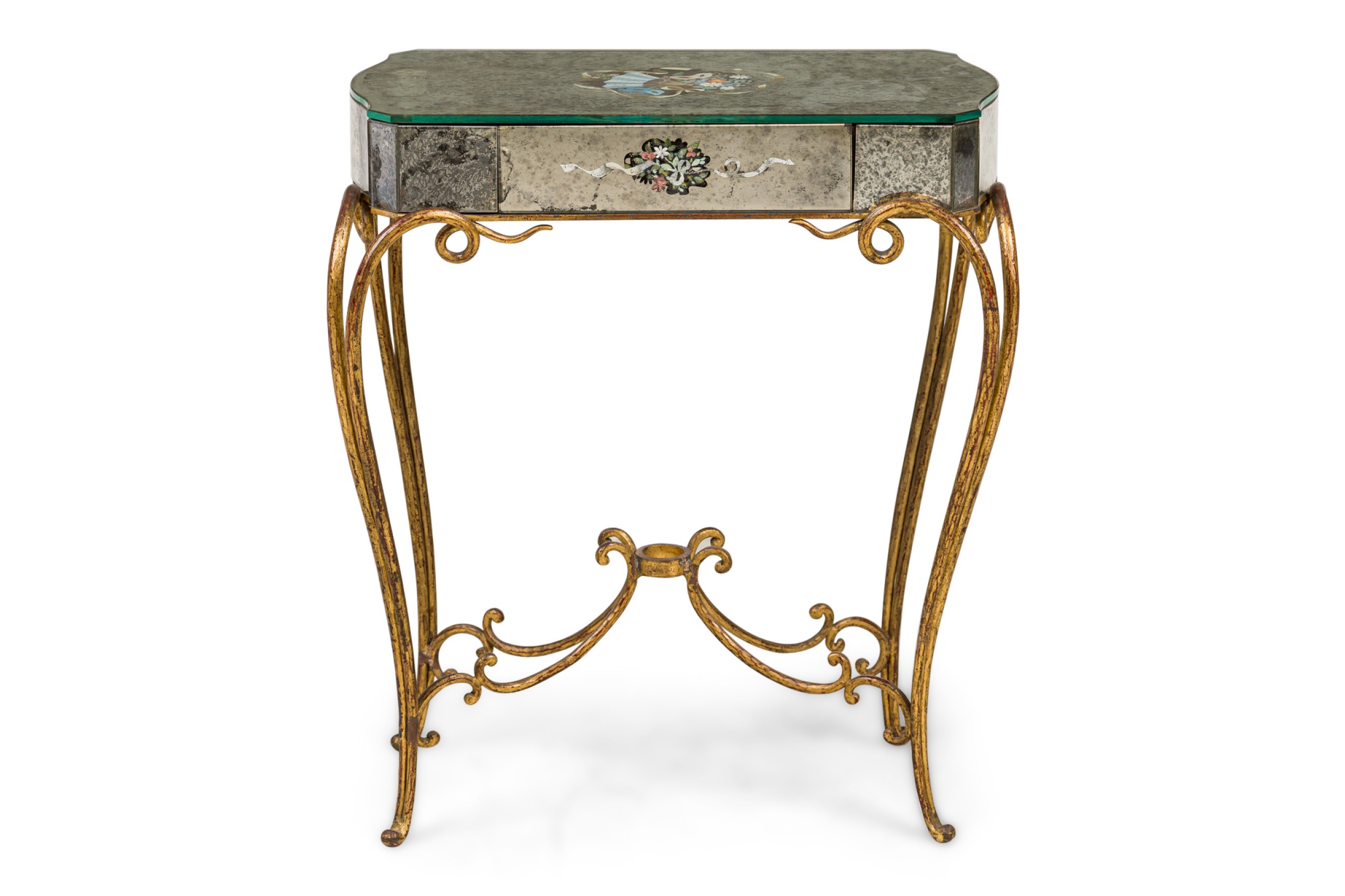 French Mid-Century (1940s) rectangular mirrored decorated end table with drawer and gilt scroll legs and stretcher. (Attributed to RENE DROUET/mirror decorated by ADRIEN EKMAN)