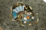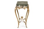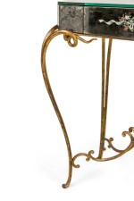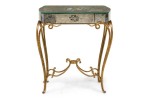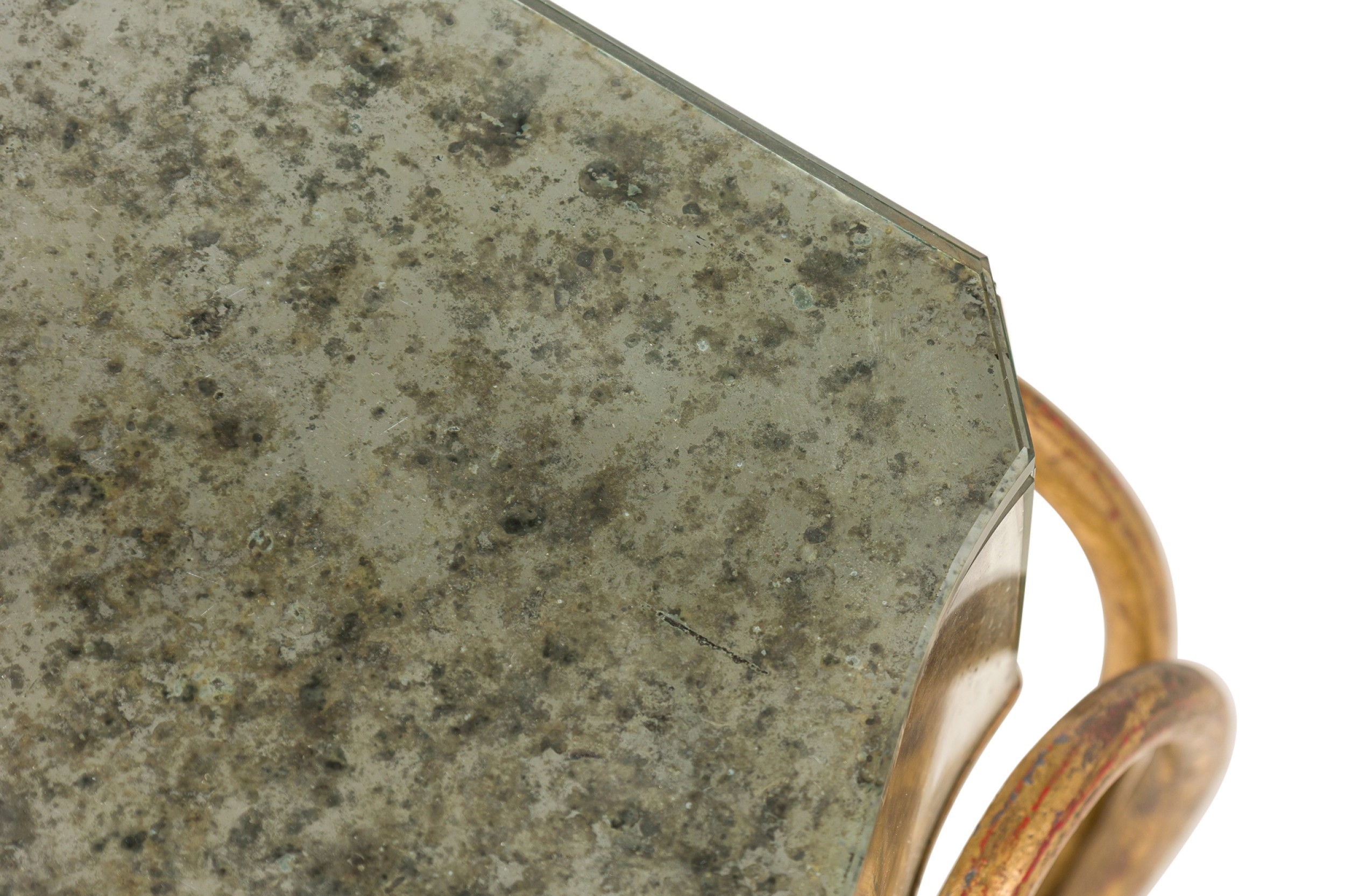 French Mid-Century (1940s) rectangular mirrored decorated end table with drawer and gilt scroll legs and stretcher. (Attributed to RENE DROUET/mirror decorated by ADRIEN EKMAN).