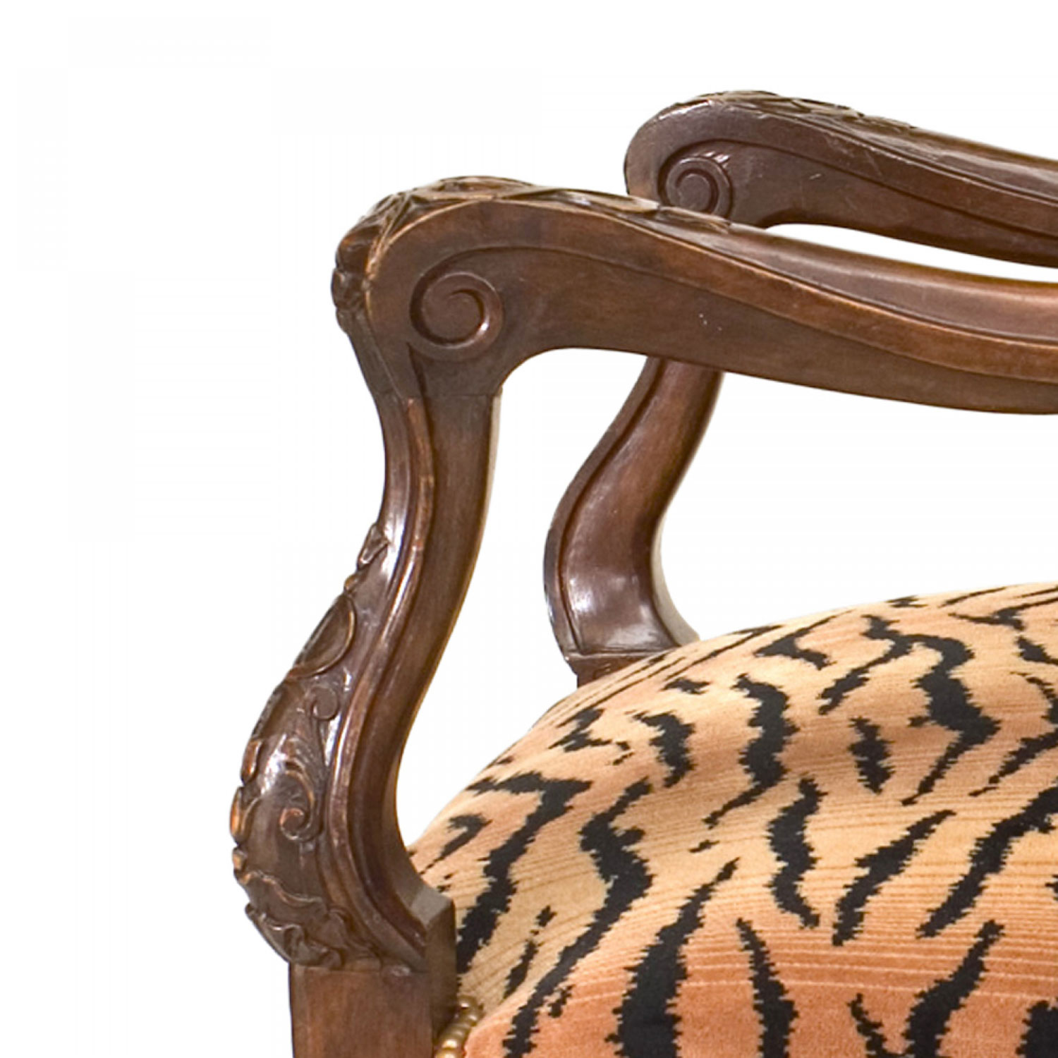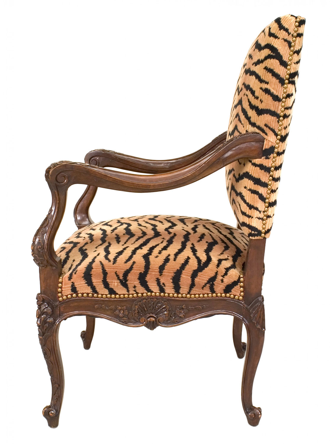 French Regence style (19th/20th Century) carved walnut open arm chair with faux tiger upholstered seat and back.