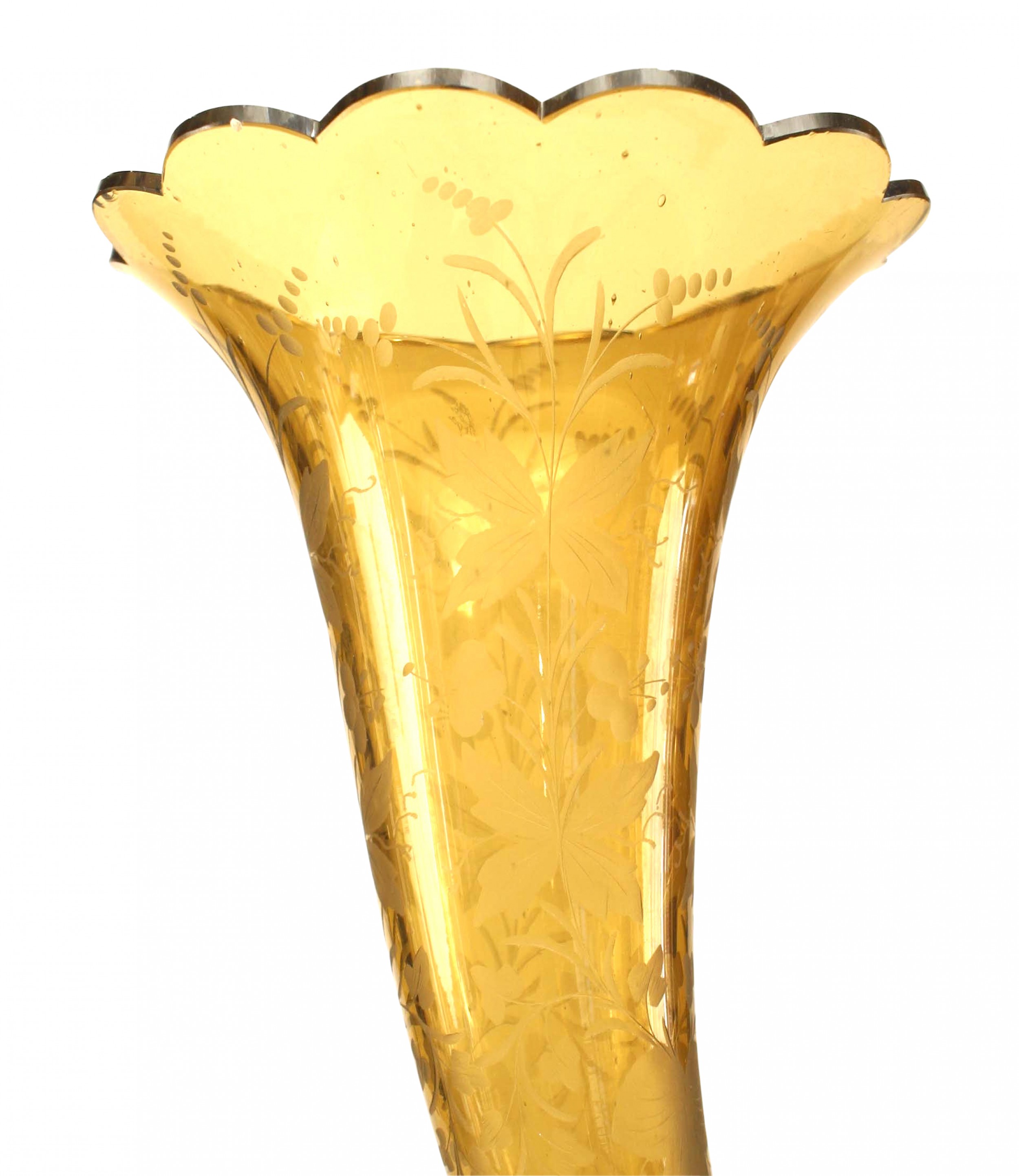 French Victorian amber crystal vase with scalloped edge, & overall etched with foliate detail and mounted on a gilt bronze scroll form base..