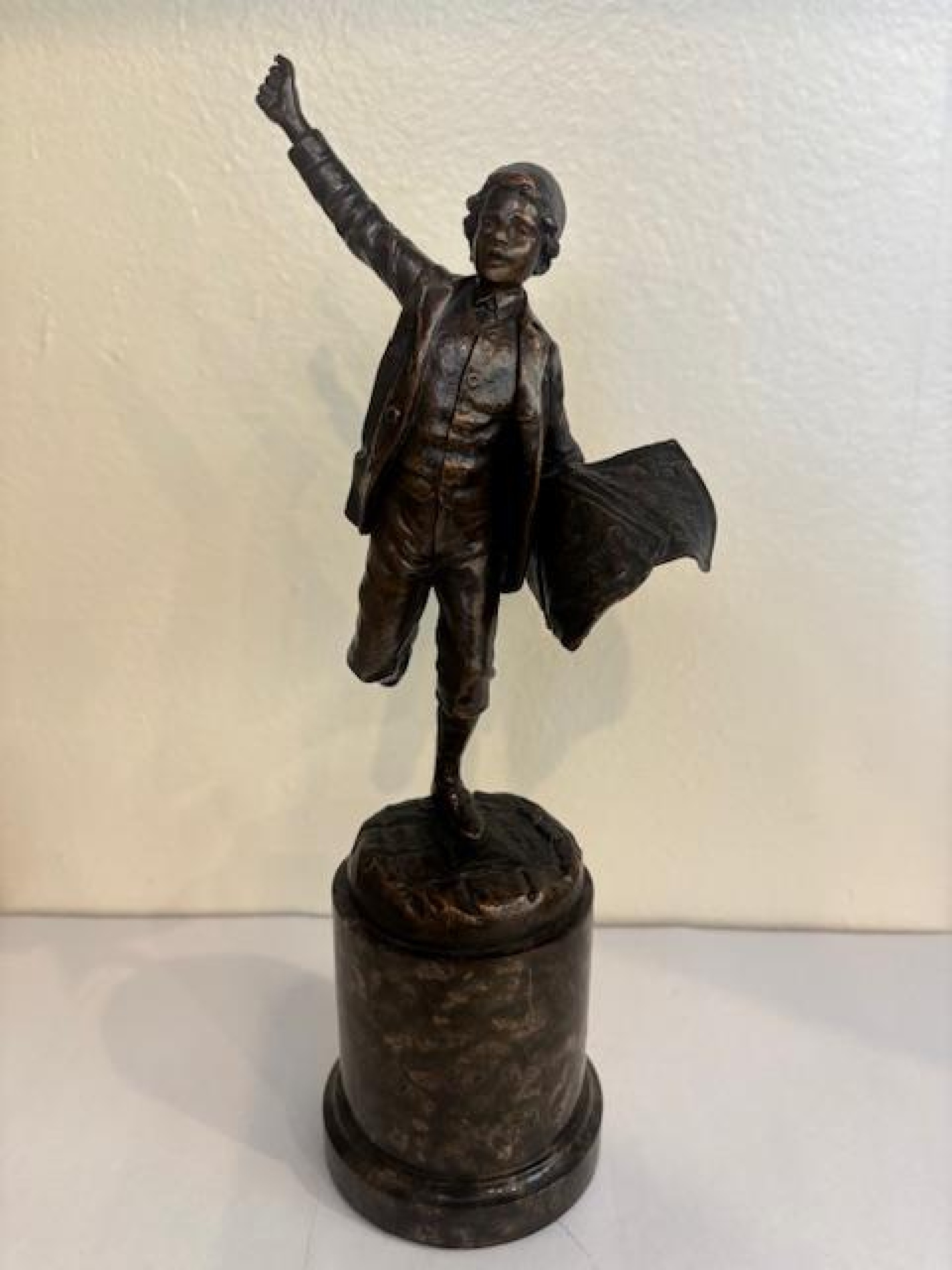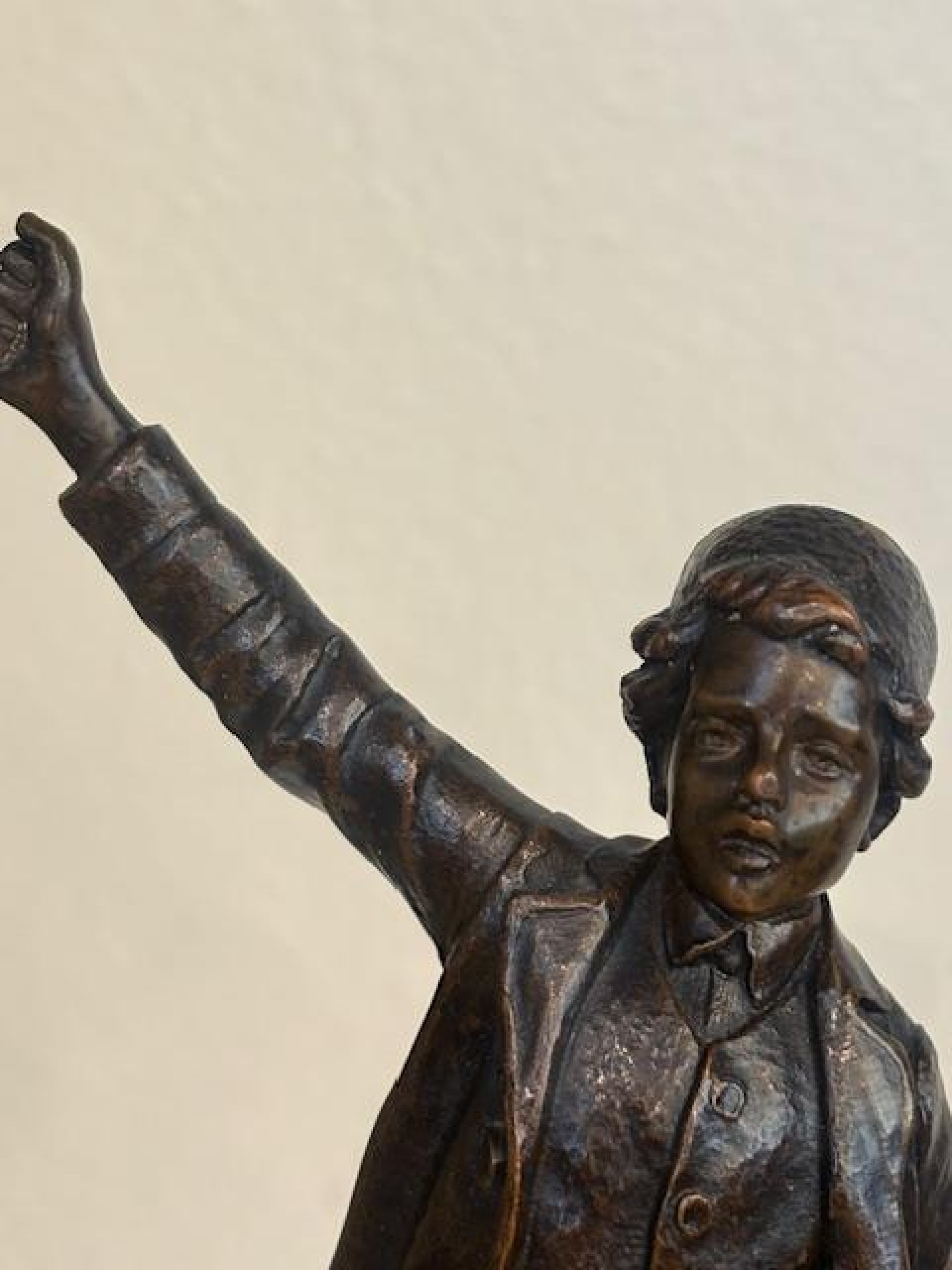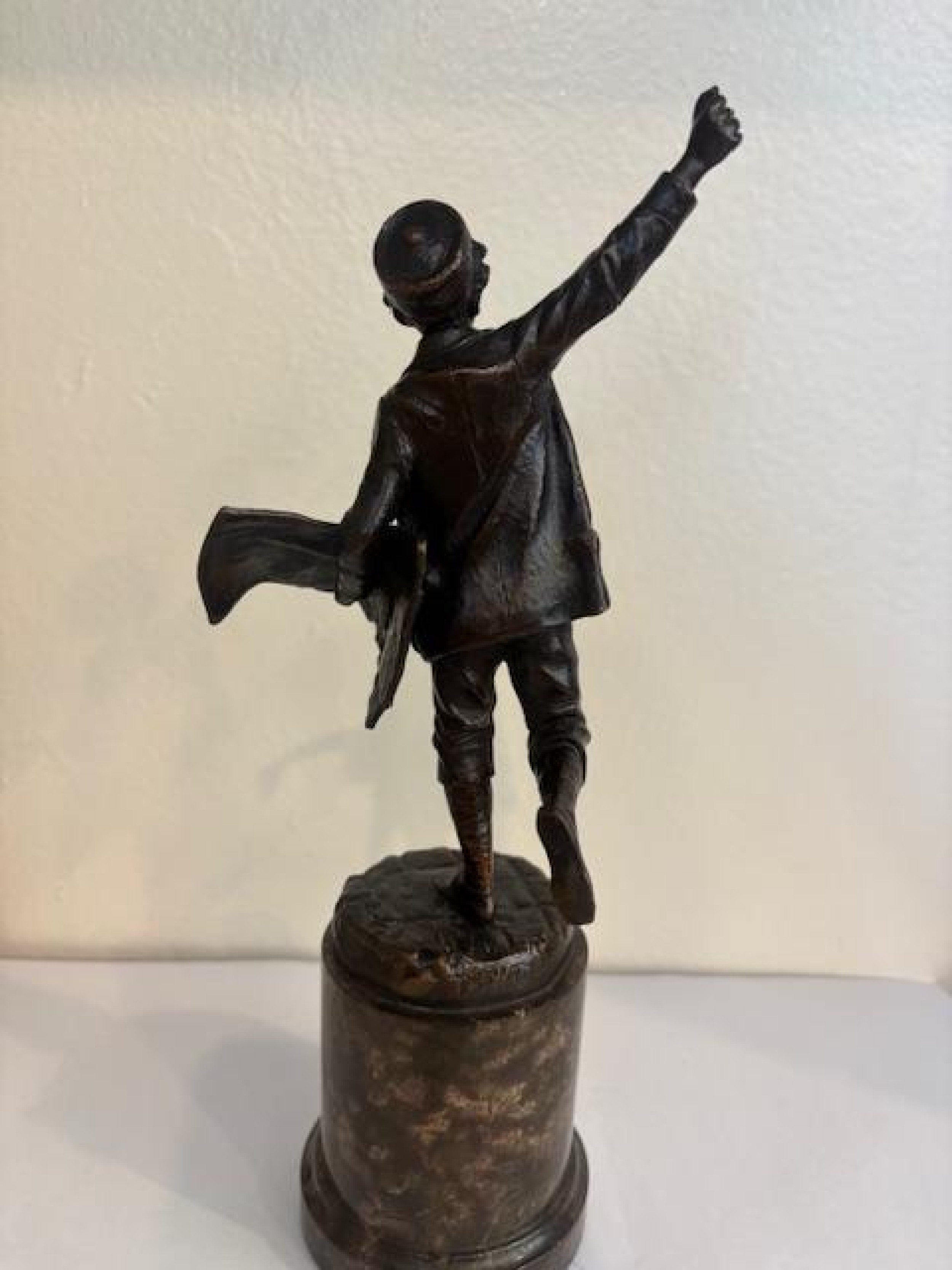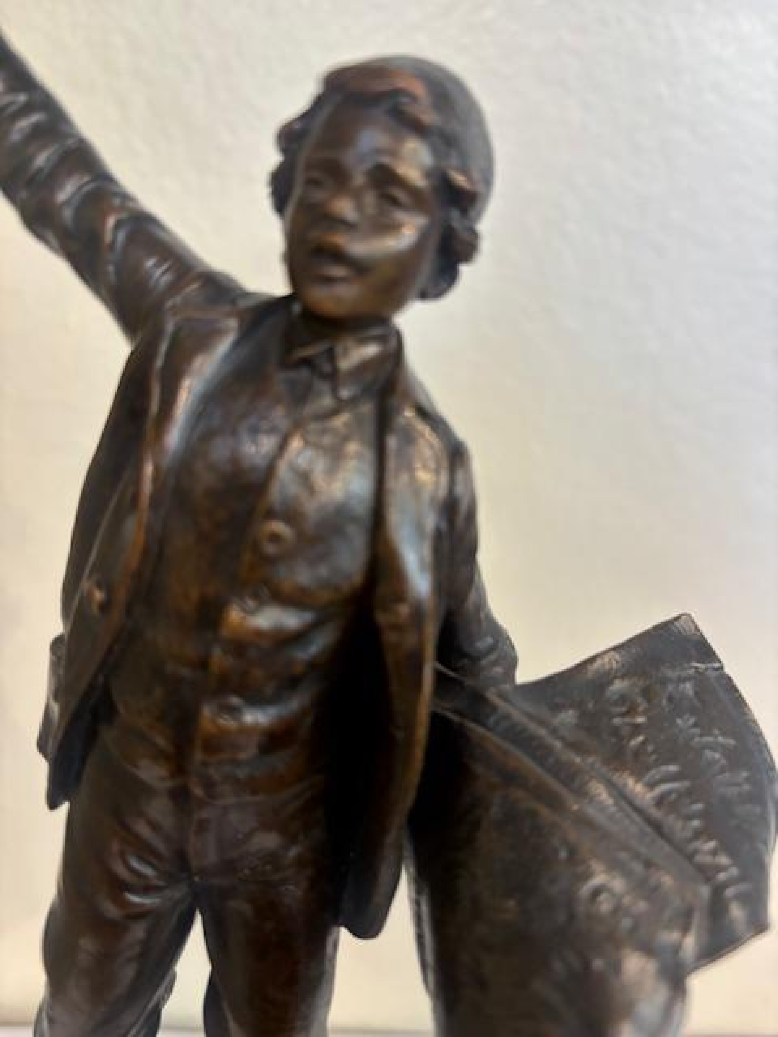 French Victorian bronze of a boy selling newspapers on a marble plinth
