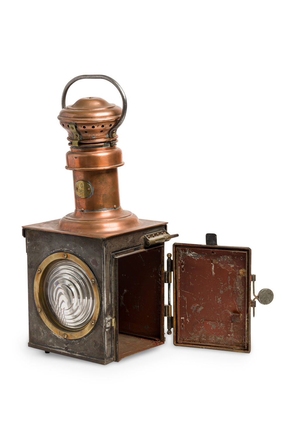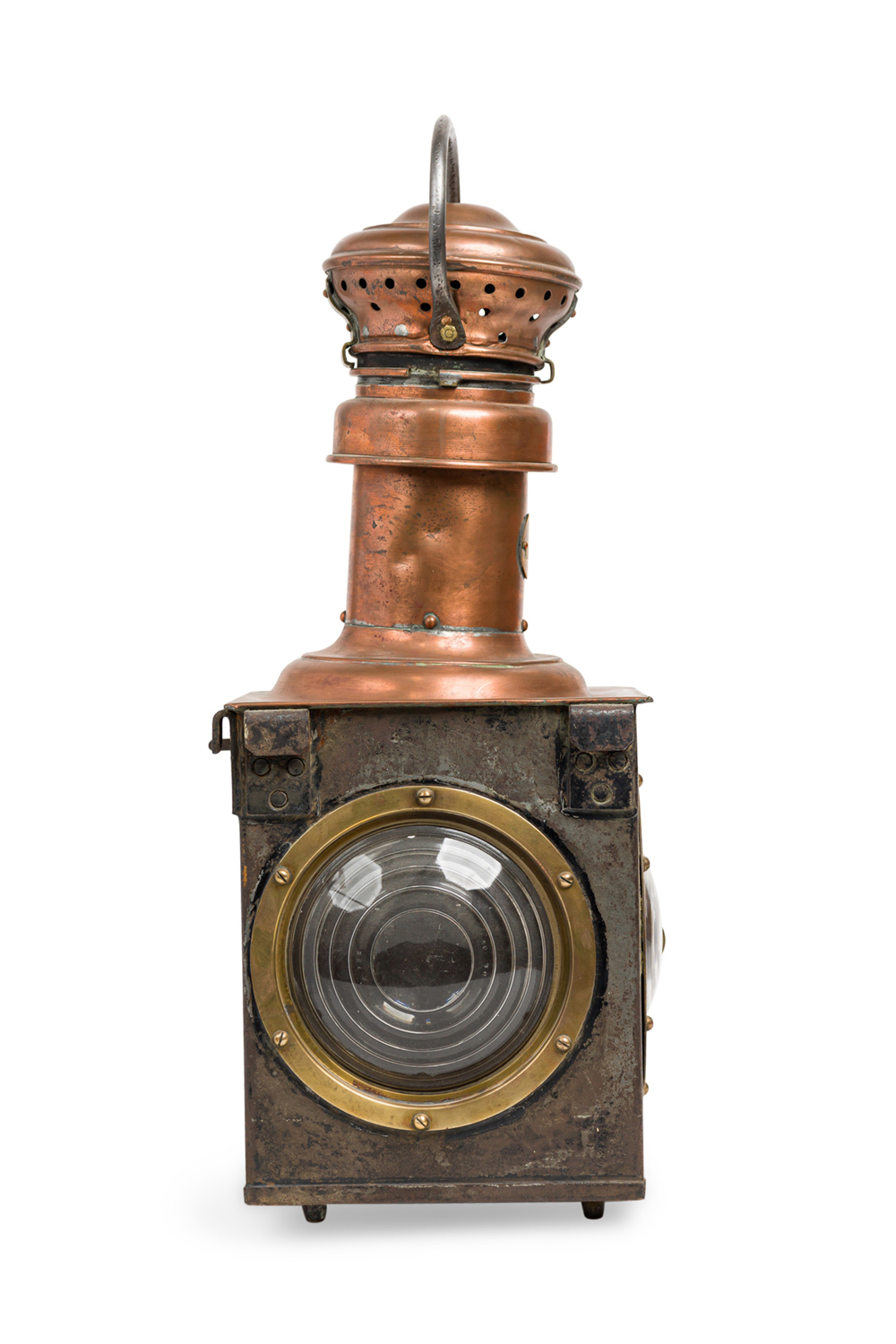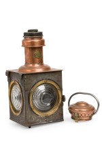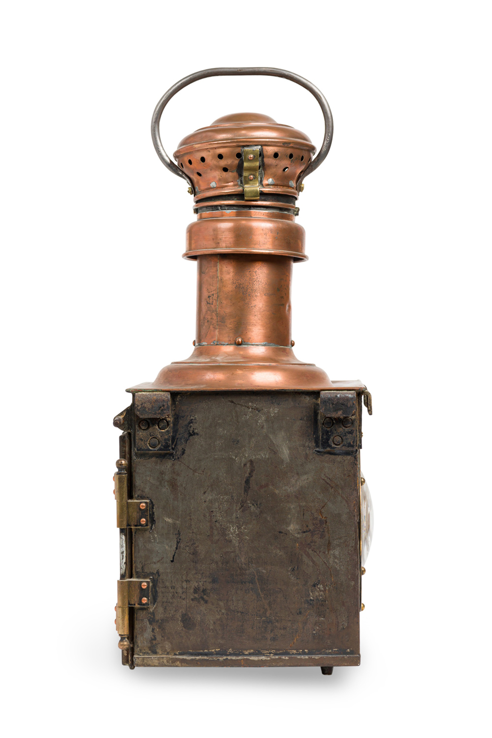 French Victorian copper square railroad embarkment lantern with 2 glass panels..