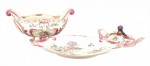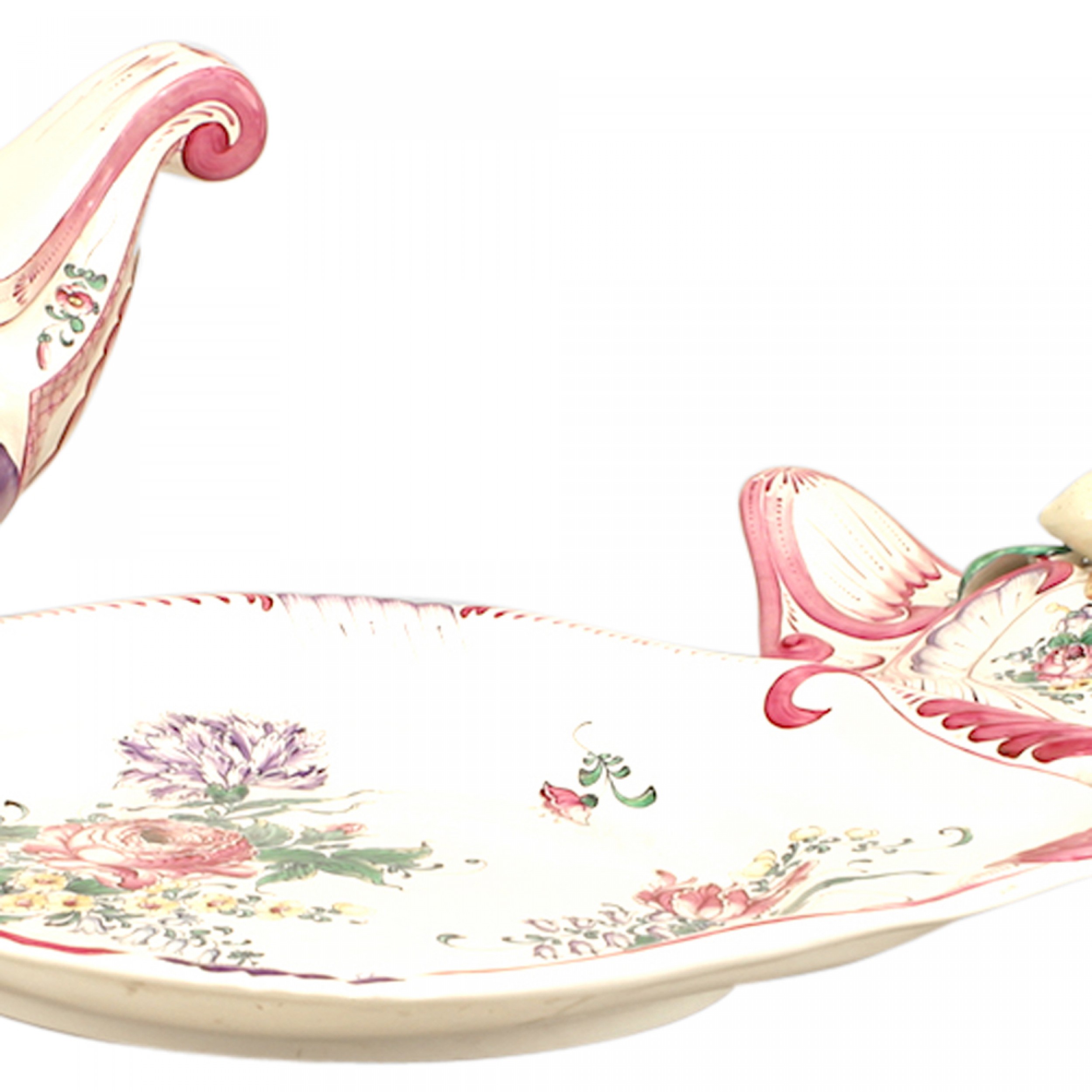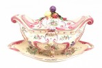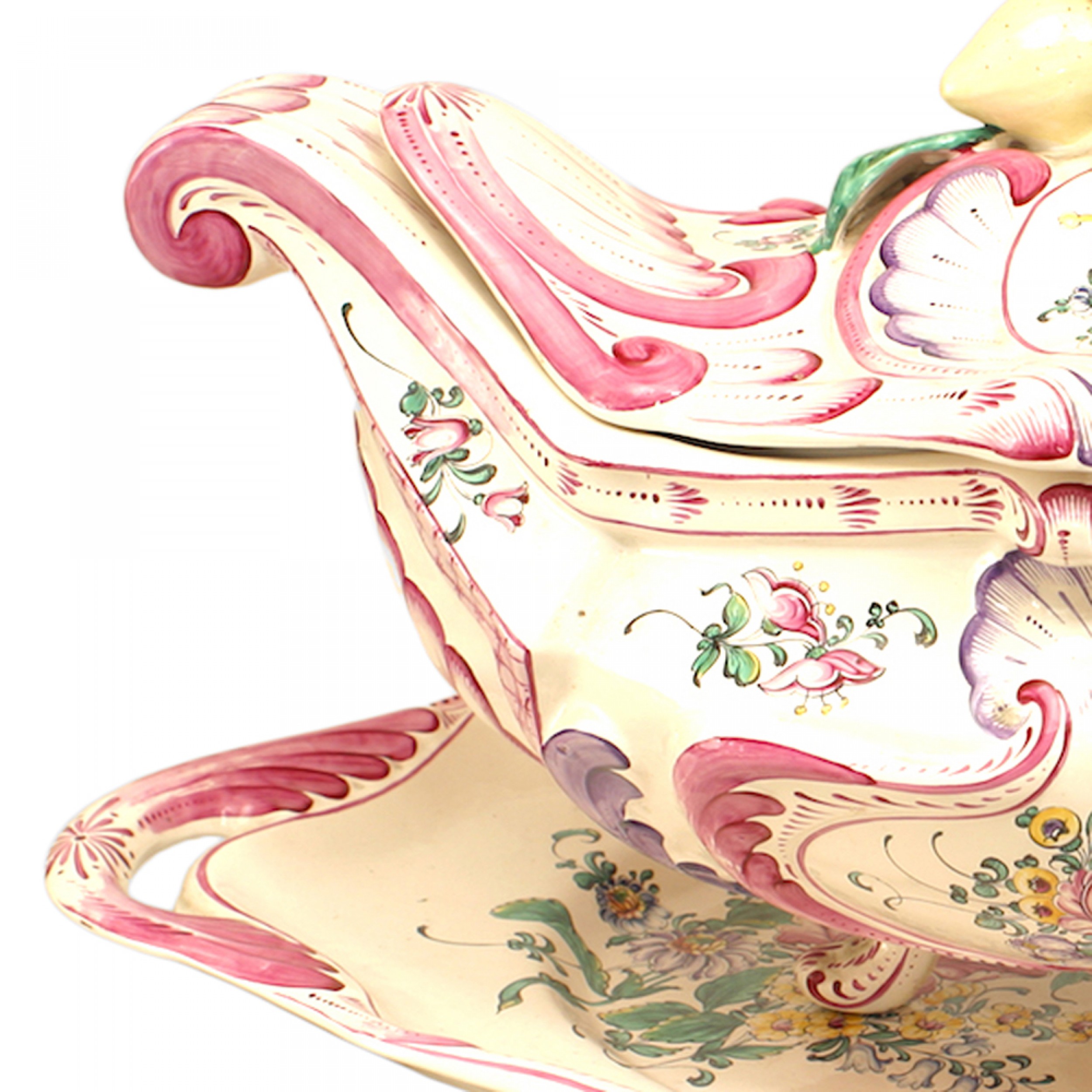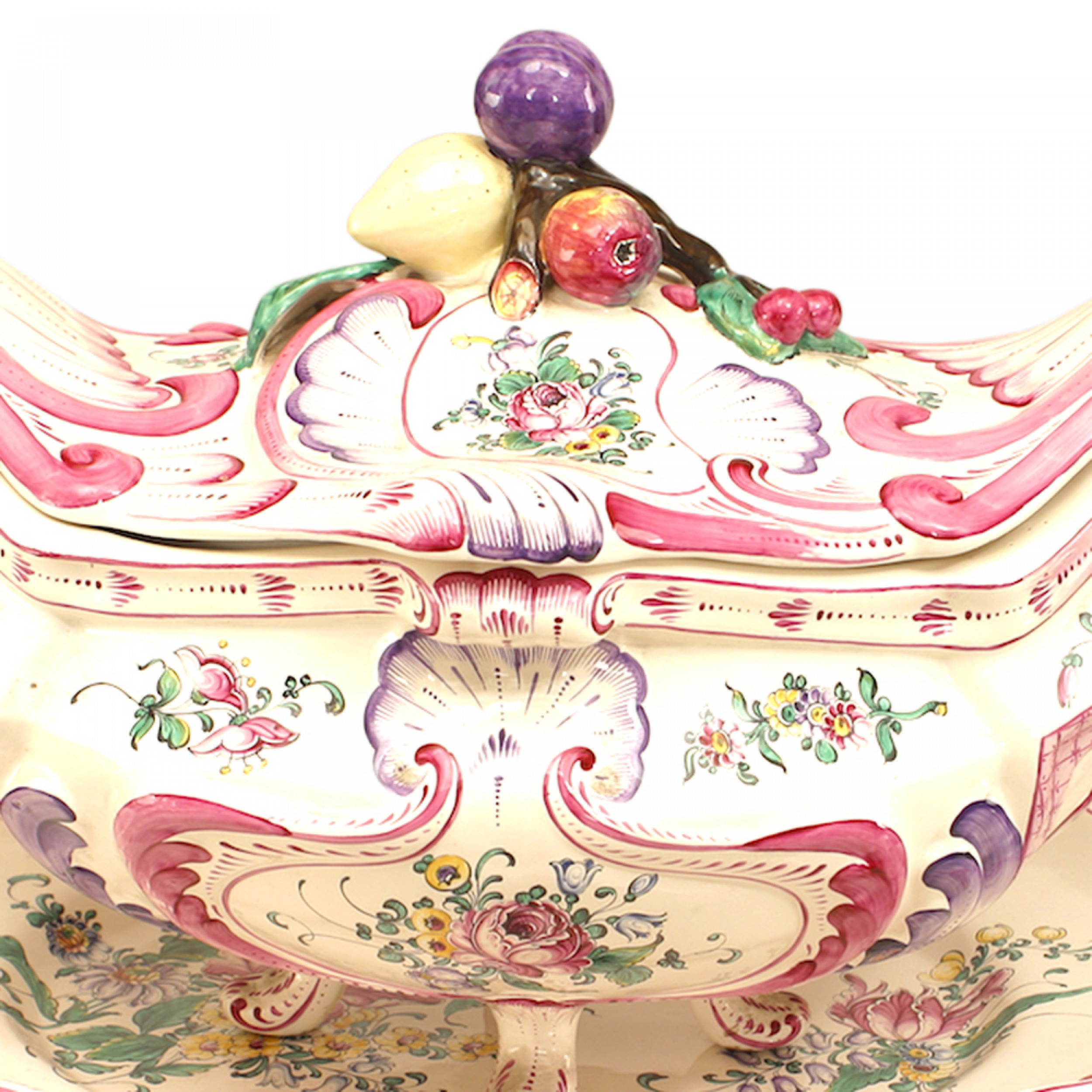 French Victorian (19/20th Century) soup tureen with extensive floral details and fruit motif handle with matching platter wide (tureen 16¾" wide)