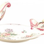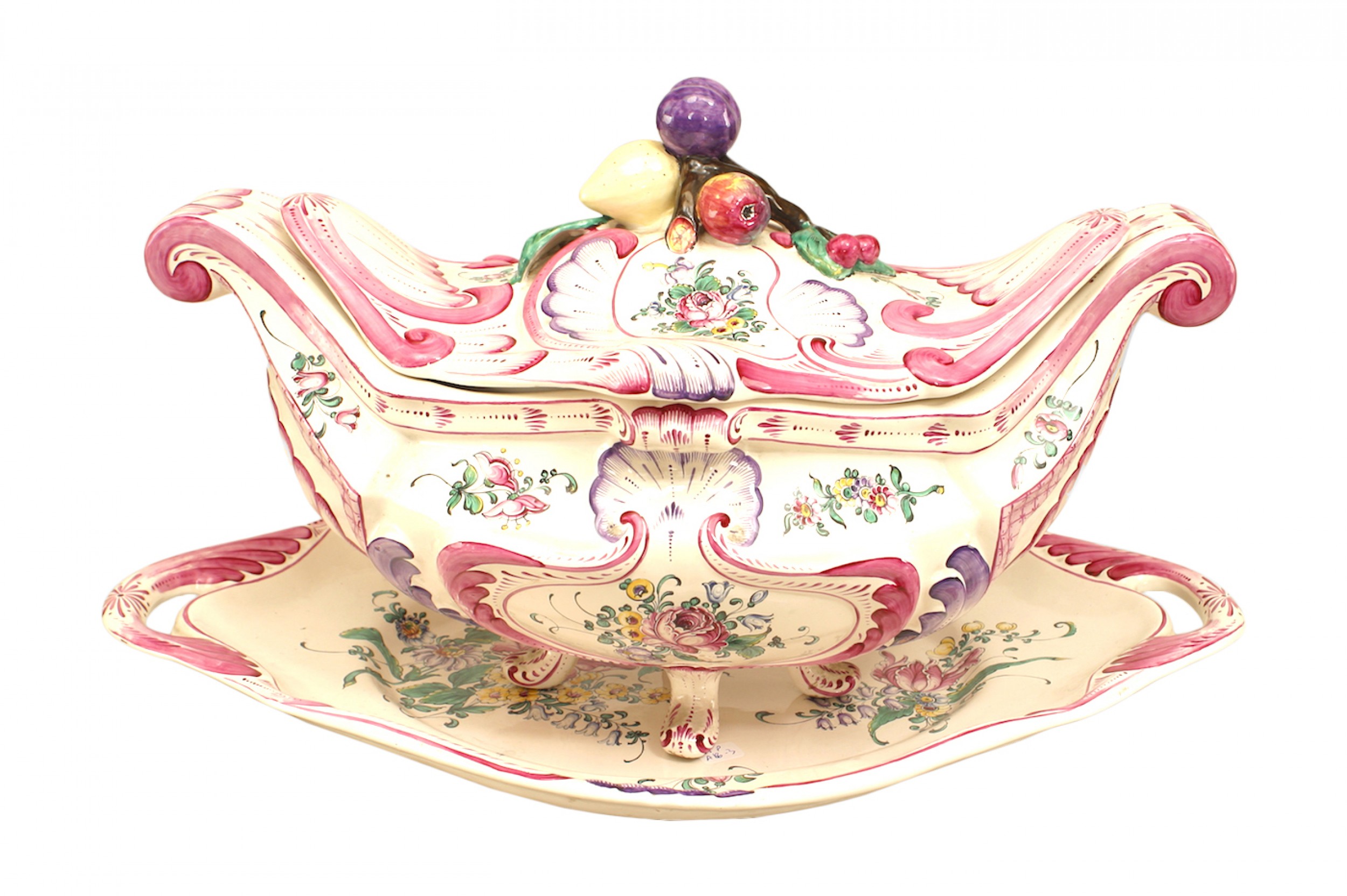 French Victorian (19/20th Century) soup tureen with extensive floral details and fruit motif handle with matching platter wide (tureen 16¾" wide).