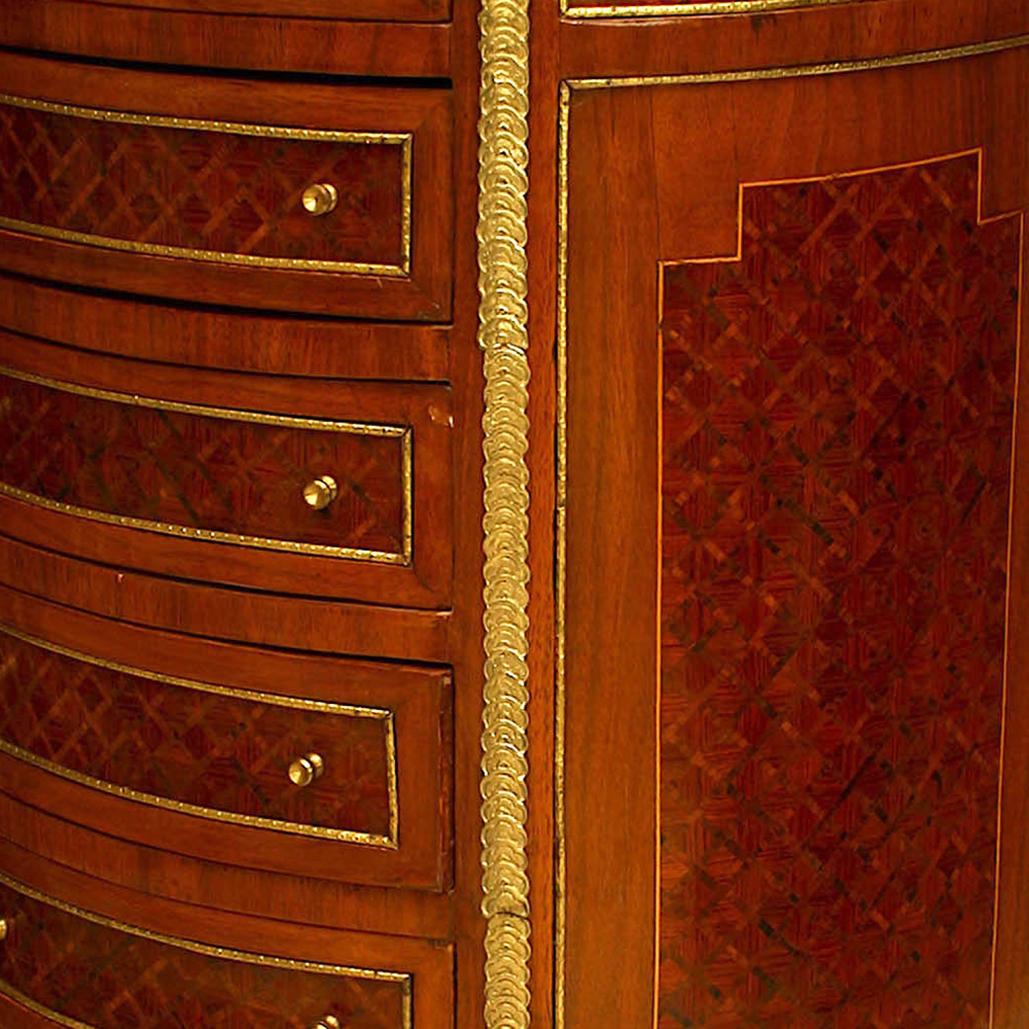 French Victorian (20th Century) fruitwood and parquetry inlaid demilune shaped narrow chest of drawers / semanier with bronze trim..