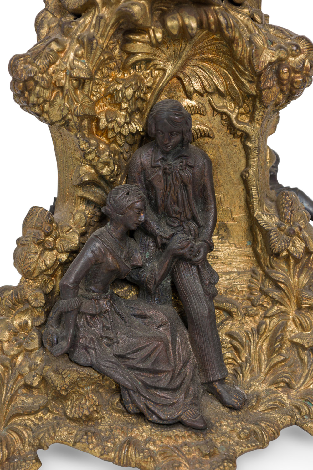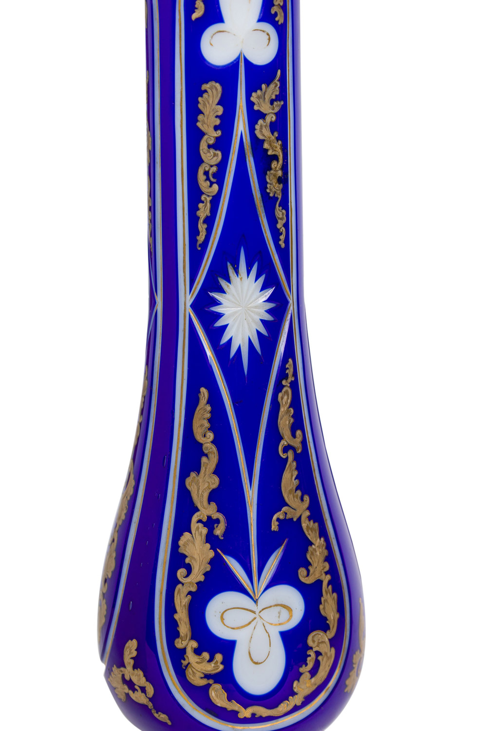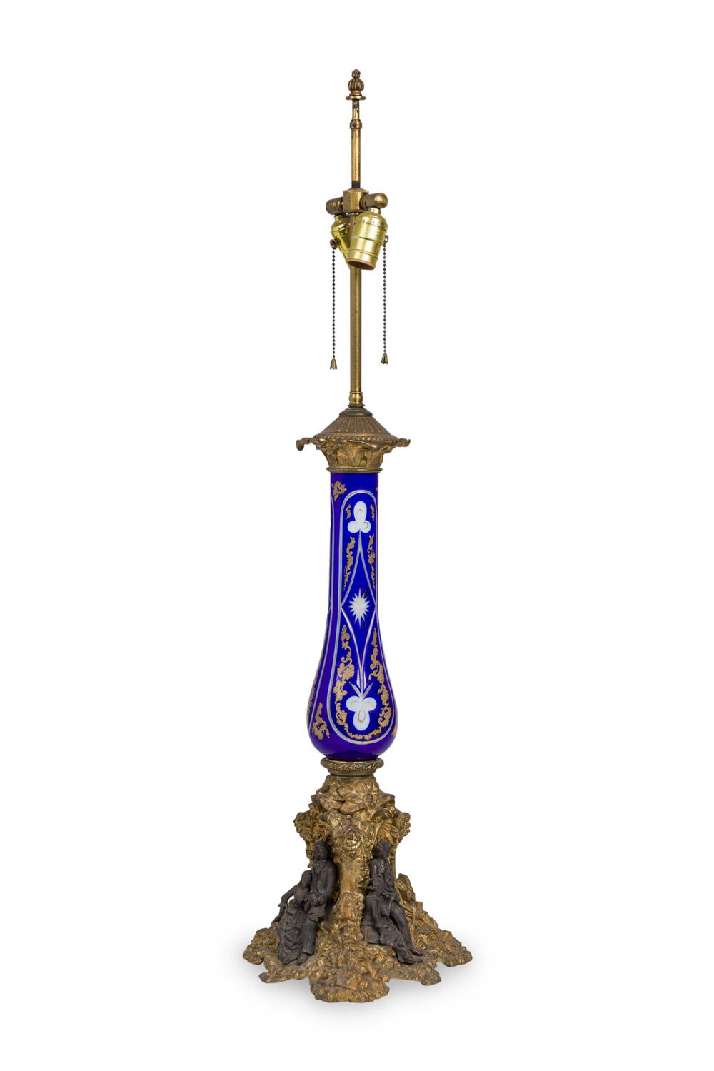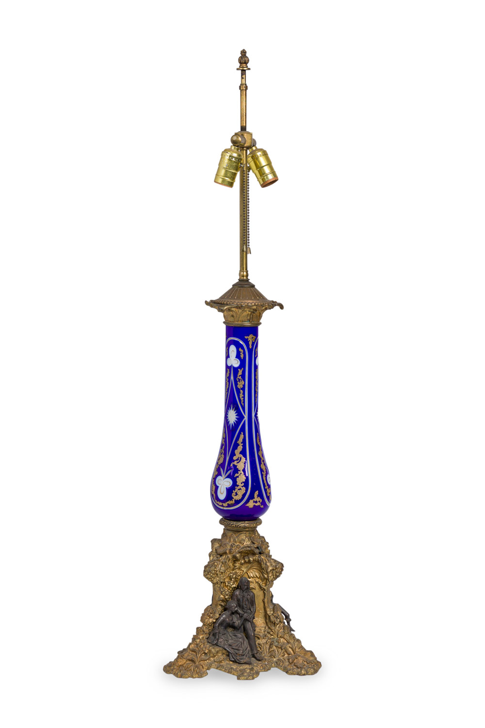 French Victorian blue & white overlay glass table lamp with bronze figures on triangular base.