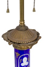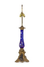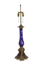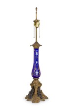 French Victorian blue & white overlay glass table lamp with bronze figures on triangular base..