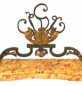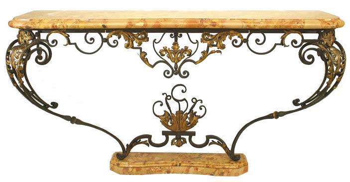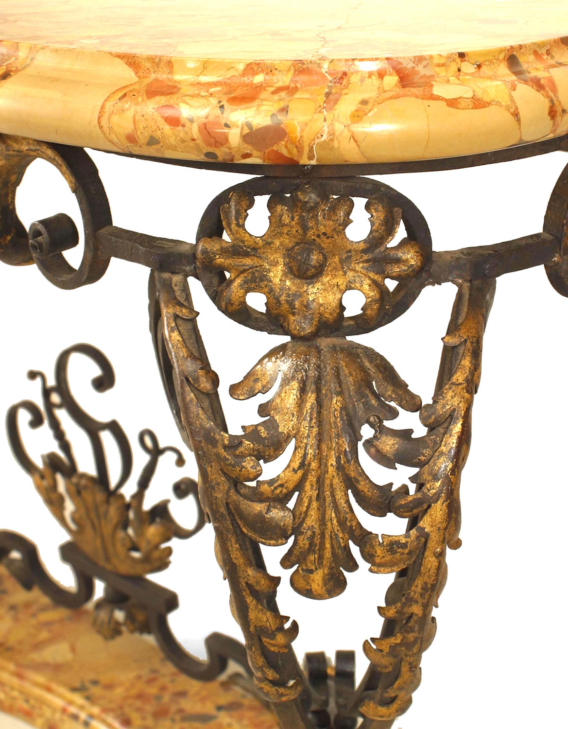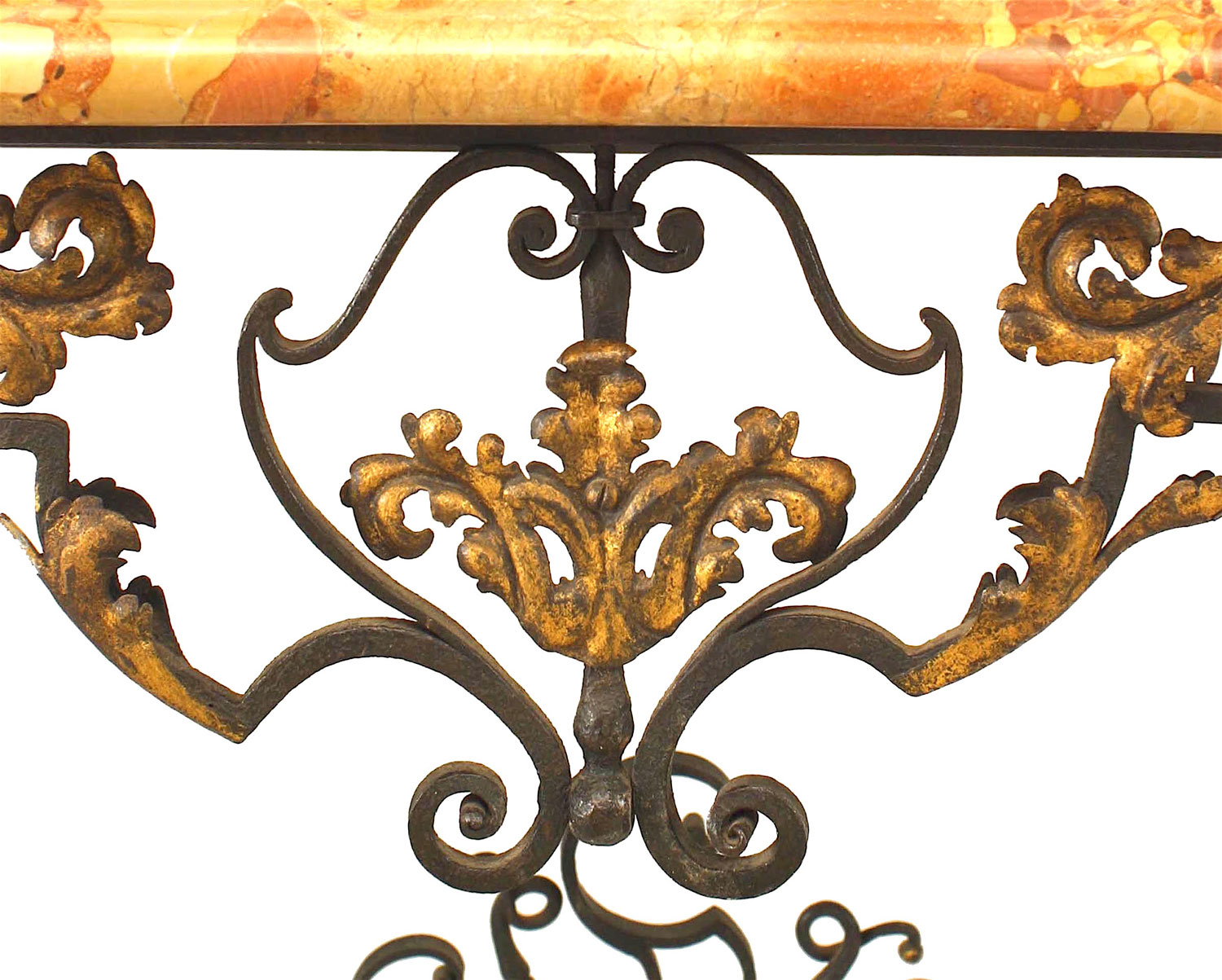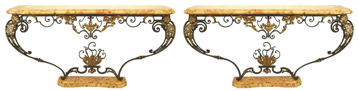 PAIR of French Victorian (Napoleon III, 19th Century) iron console table with scroll form design and applied gold painted floral trim with a stretcher and a Breche d'Alep marble base & top. (PRICED AS PAIR)