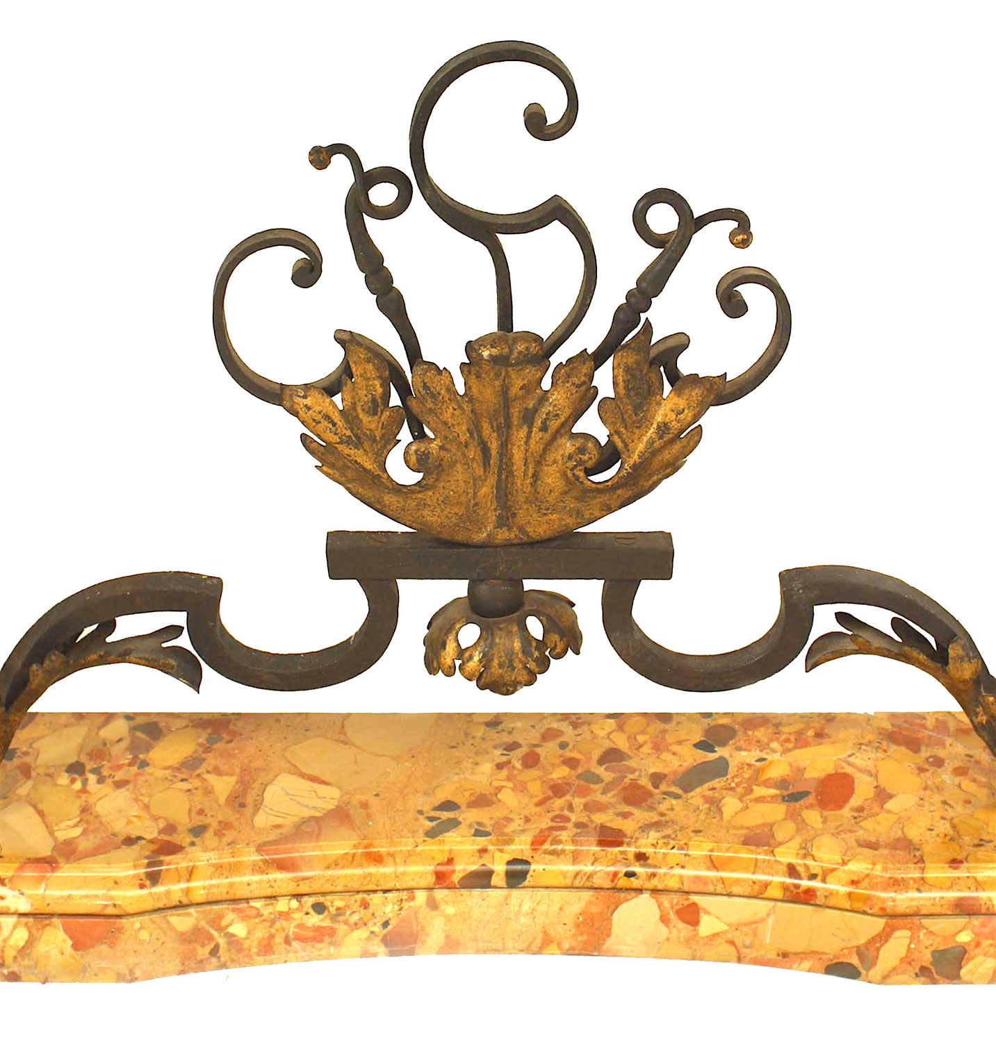 Style: French Materials & Techniques: Gold, iron, iron / wrought iron, marble Category: Tables, Dining Room Condition: These are bracket consoles so they need to be attached to a wall.