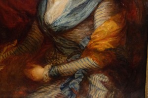 Gilt framed oil painting portrait of lady wearing black hat and blue striped dress.