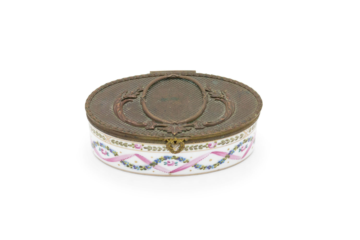French Victorian (19th Cent) small porcelain Sevre oval box with bronze lid and pink & white decoration and interior with flowers (signed on bottom).