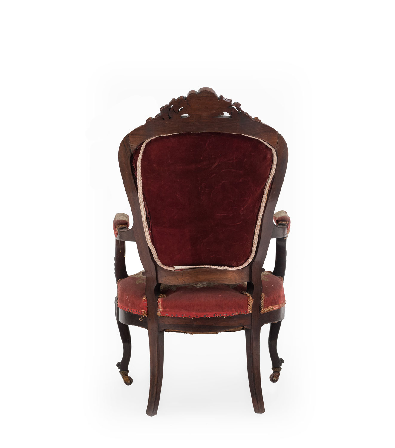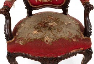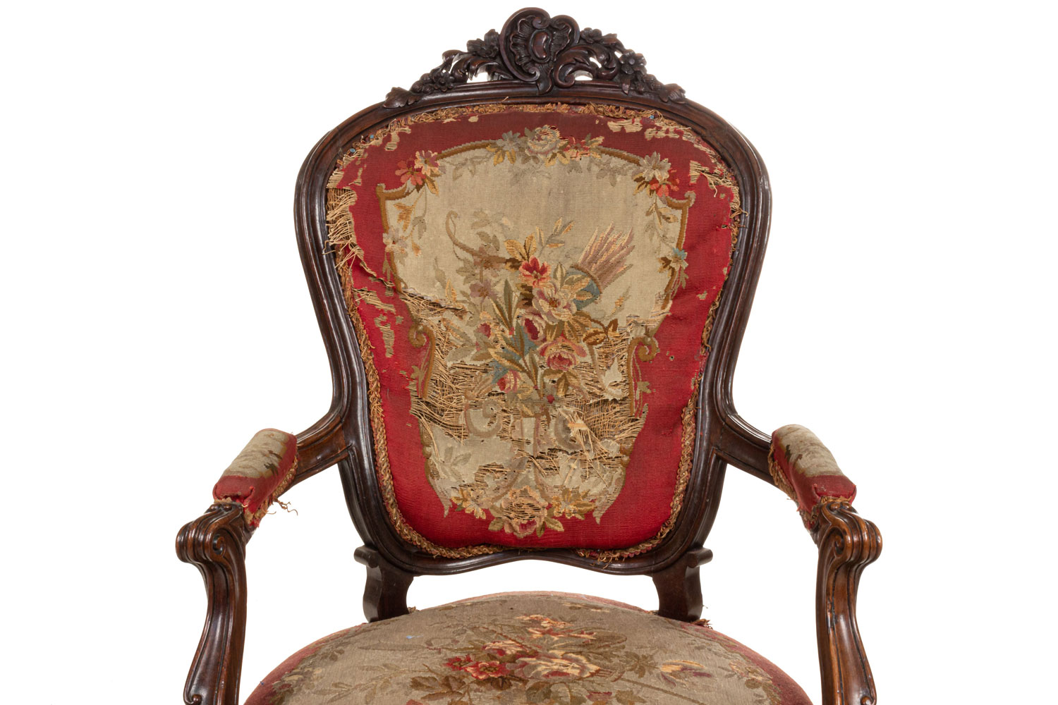 Style: French Materials & Techniques: Carved, crest, rosewood, wood Category: Seating Condition: Antique condition, upholstery is very worn and has some holes, loss to rope trim.