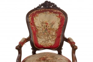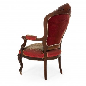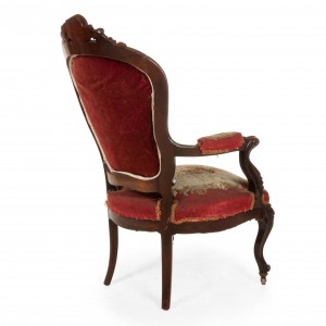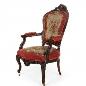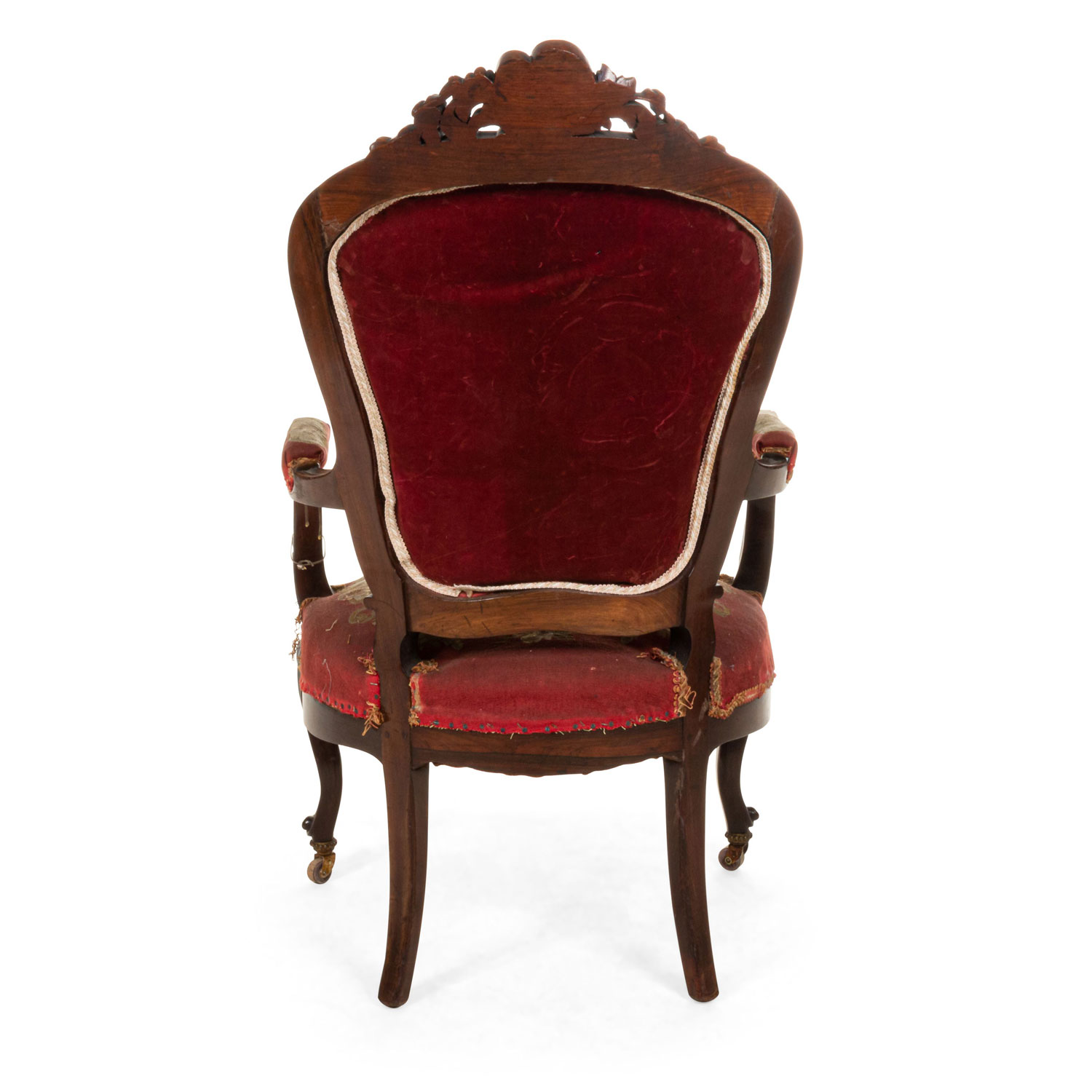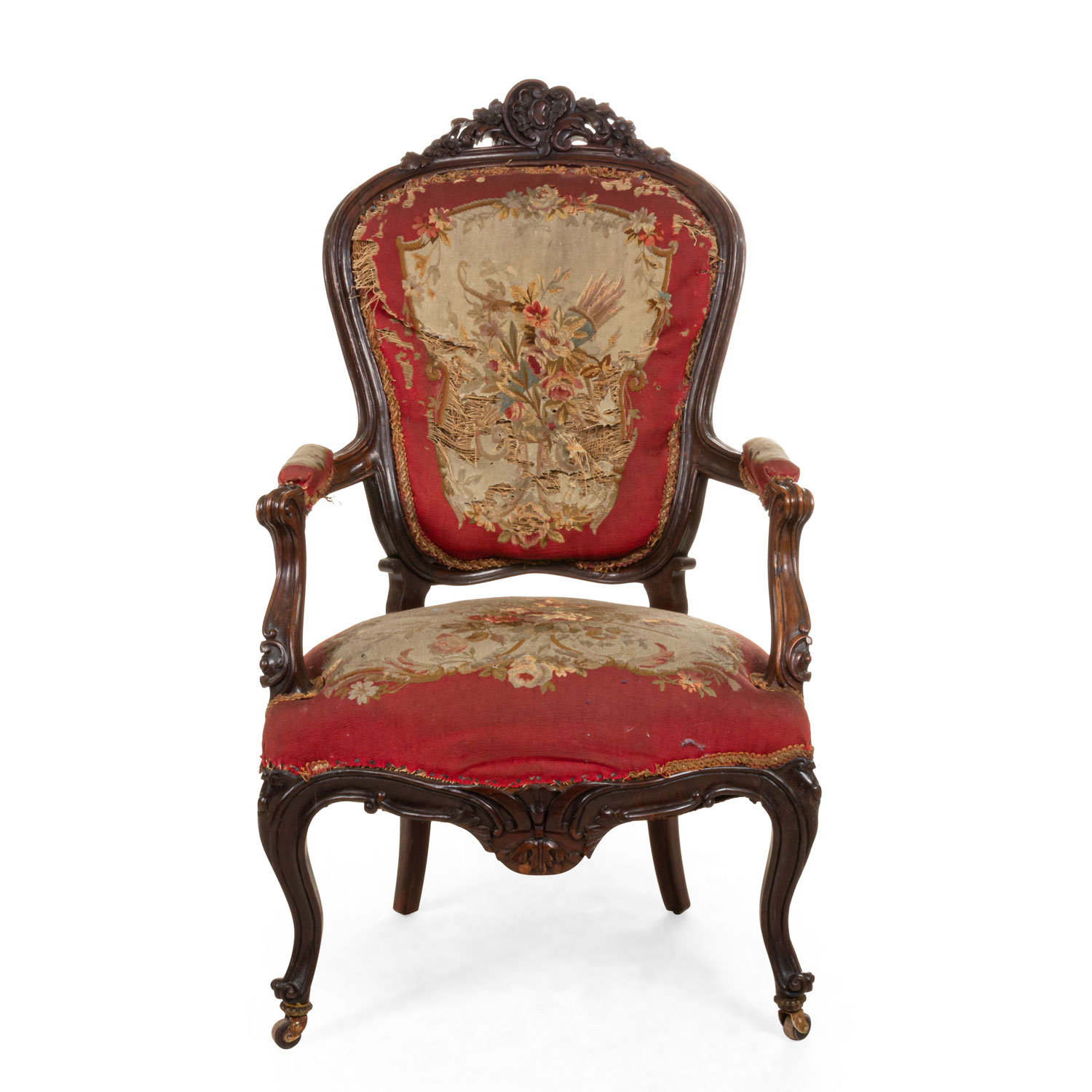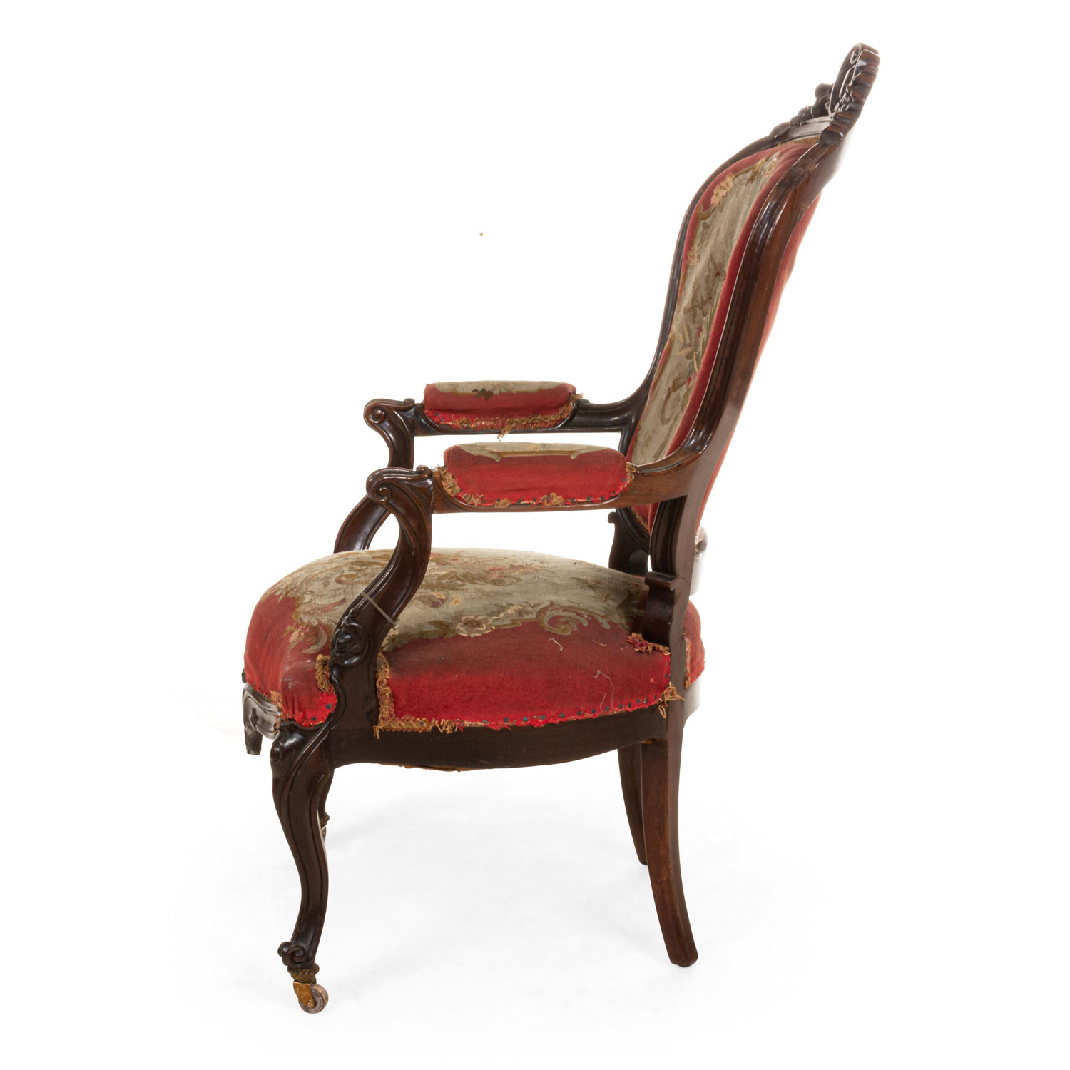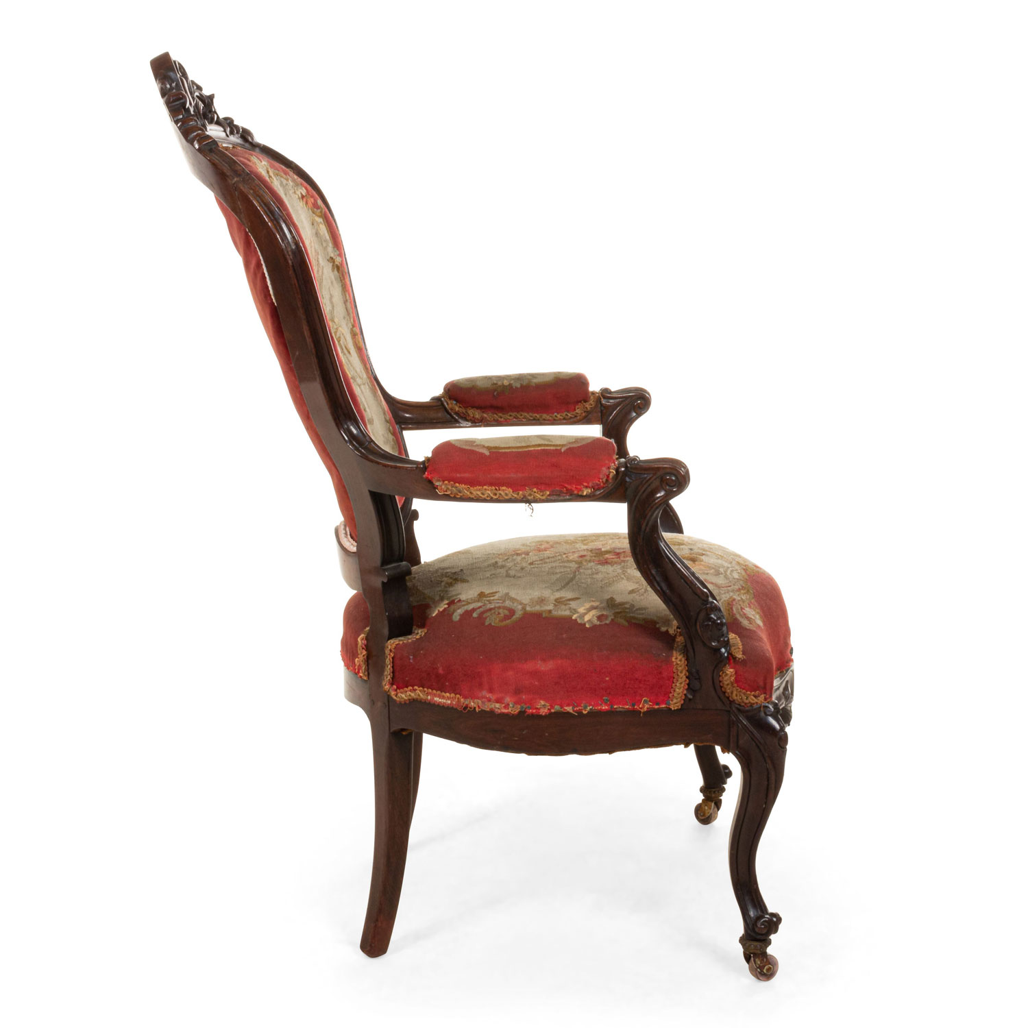 PAIR of French Victorian rosewood armchairs with carved back crest rail and red floral Aubusson upholstery. (similar to #038110C).
